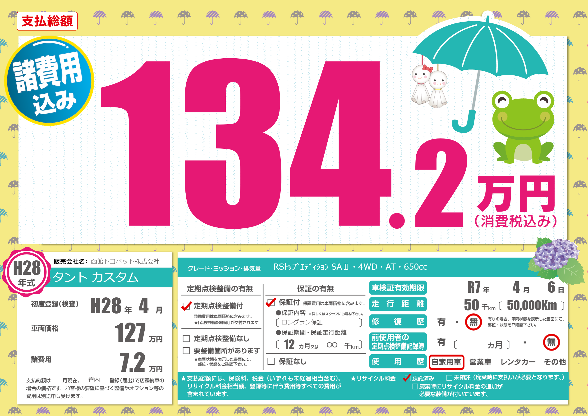 | 走行キロ | 5万km | 初年度登録 | H28年4月 |