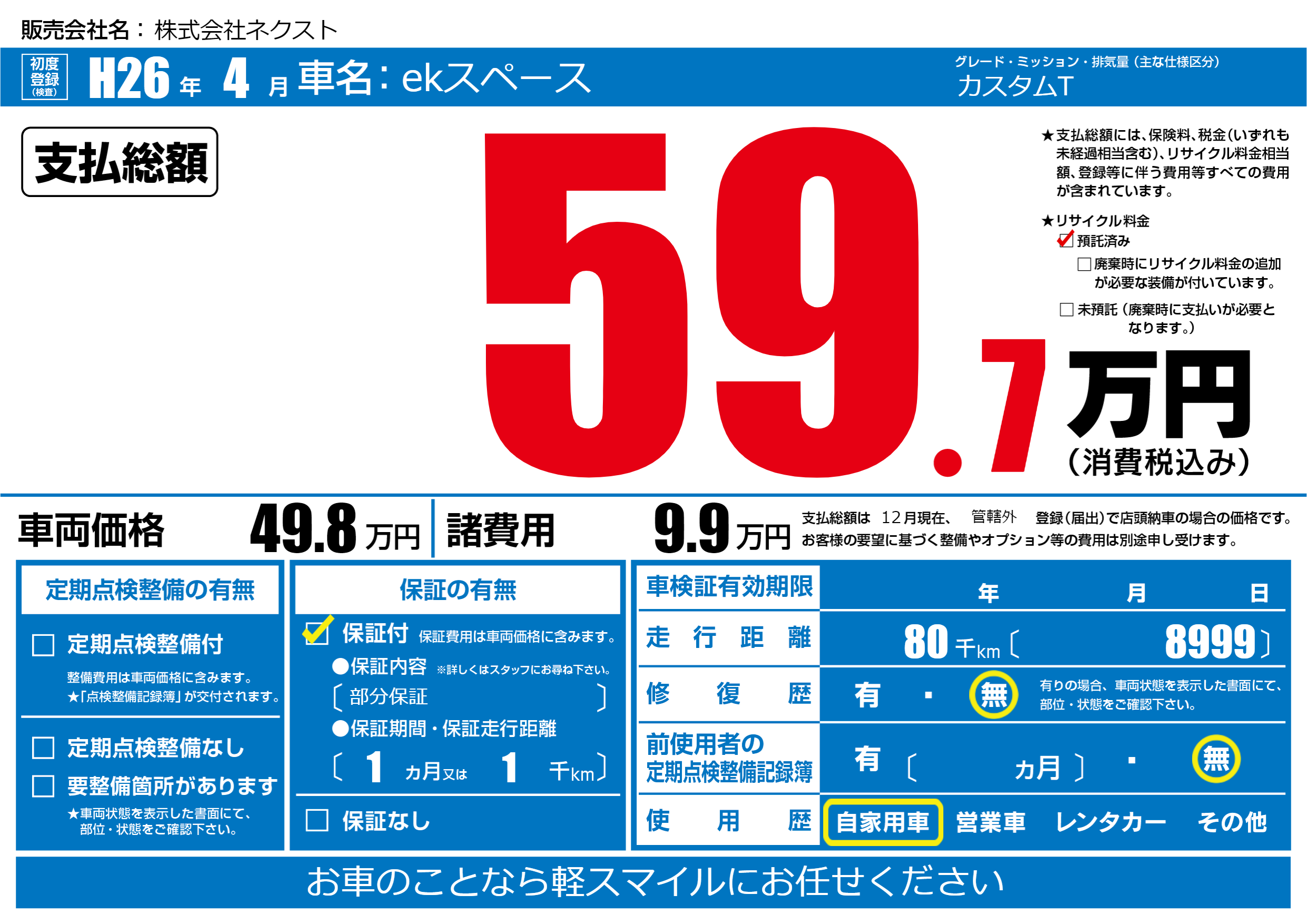 | 走行キロ | 8万km | 初年度登録 | H26年4月 |
