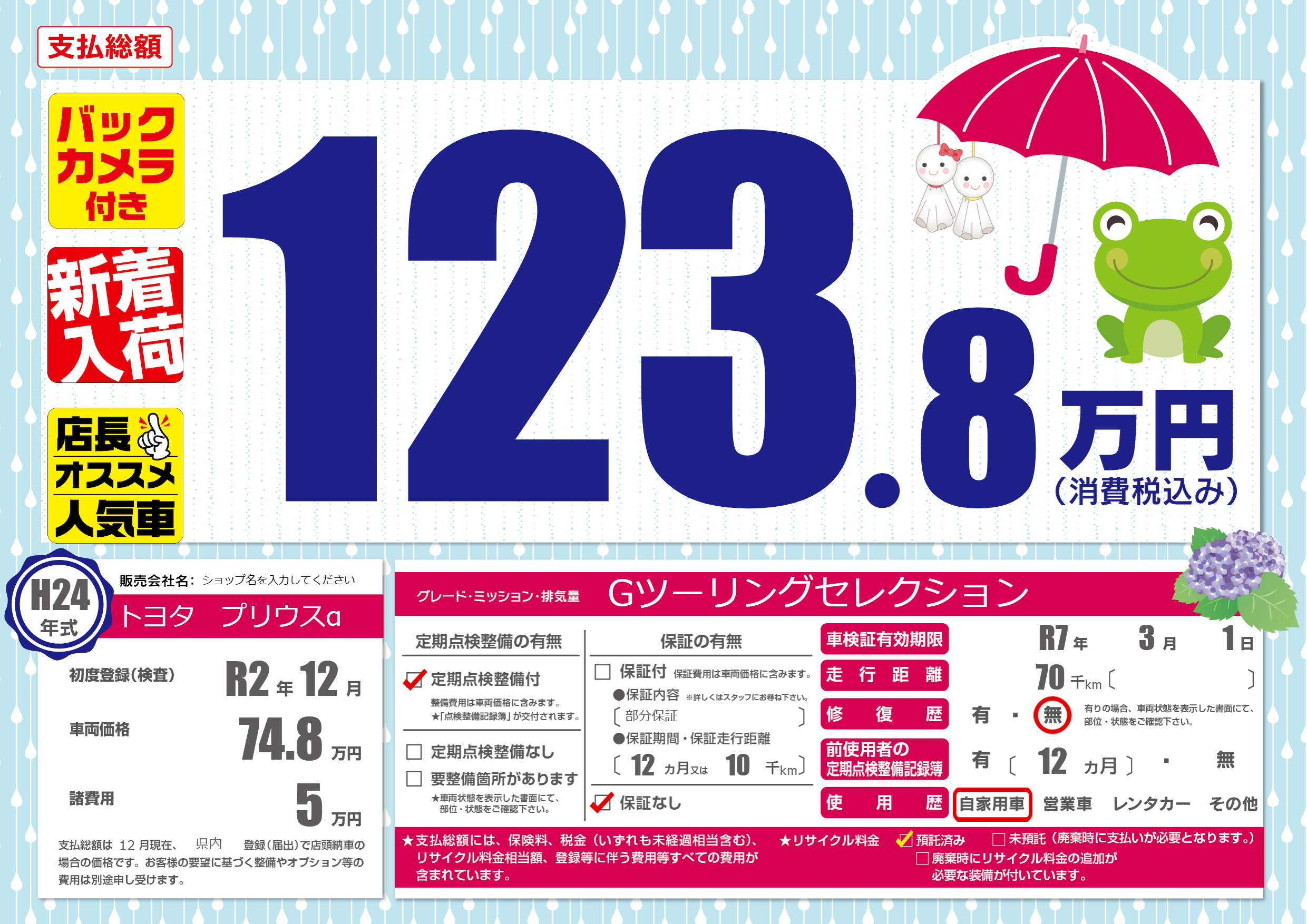| 車名 | トヨタ プリウスα | グレード ミッション 排気量 |