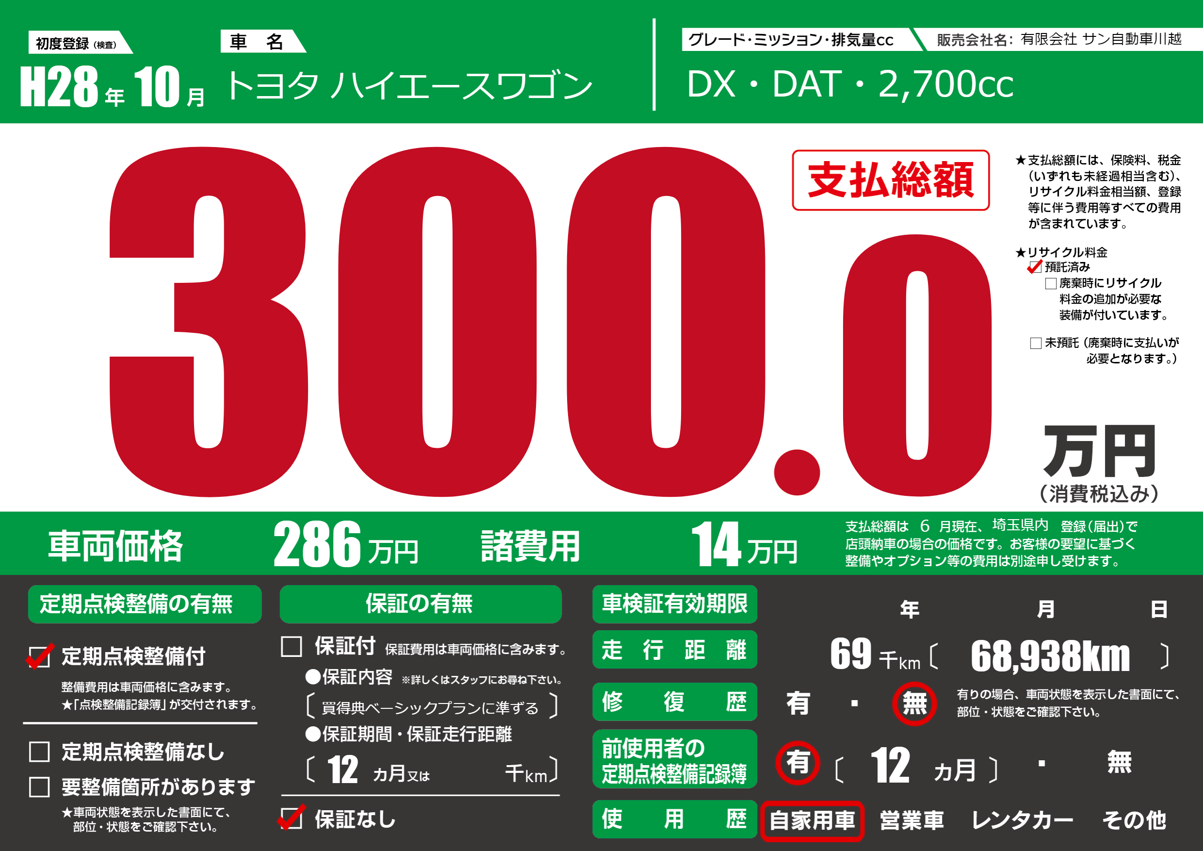 | 車名 | トヨタ ハイエースワゴン | グレード ミッション 排気量 |