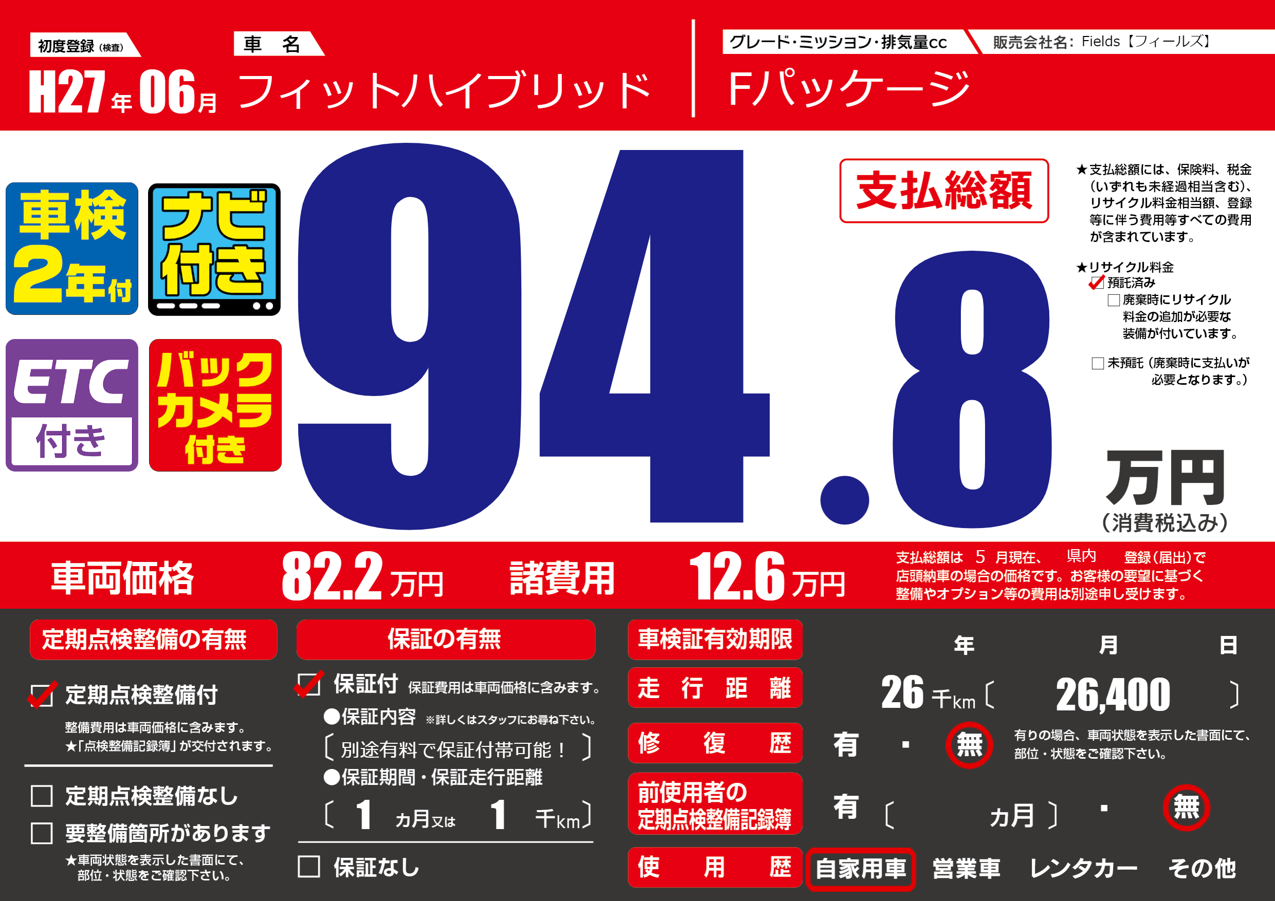 | 走行キロ | 2.6万km | 初年度登録 | H27年06月 |