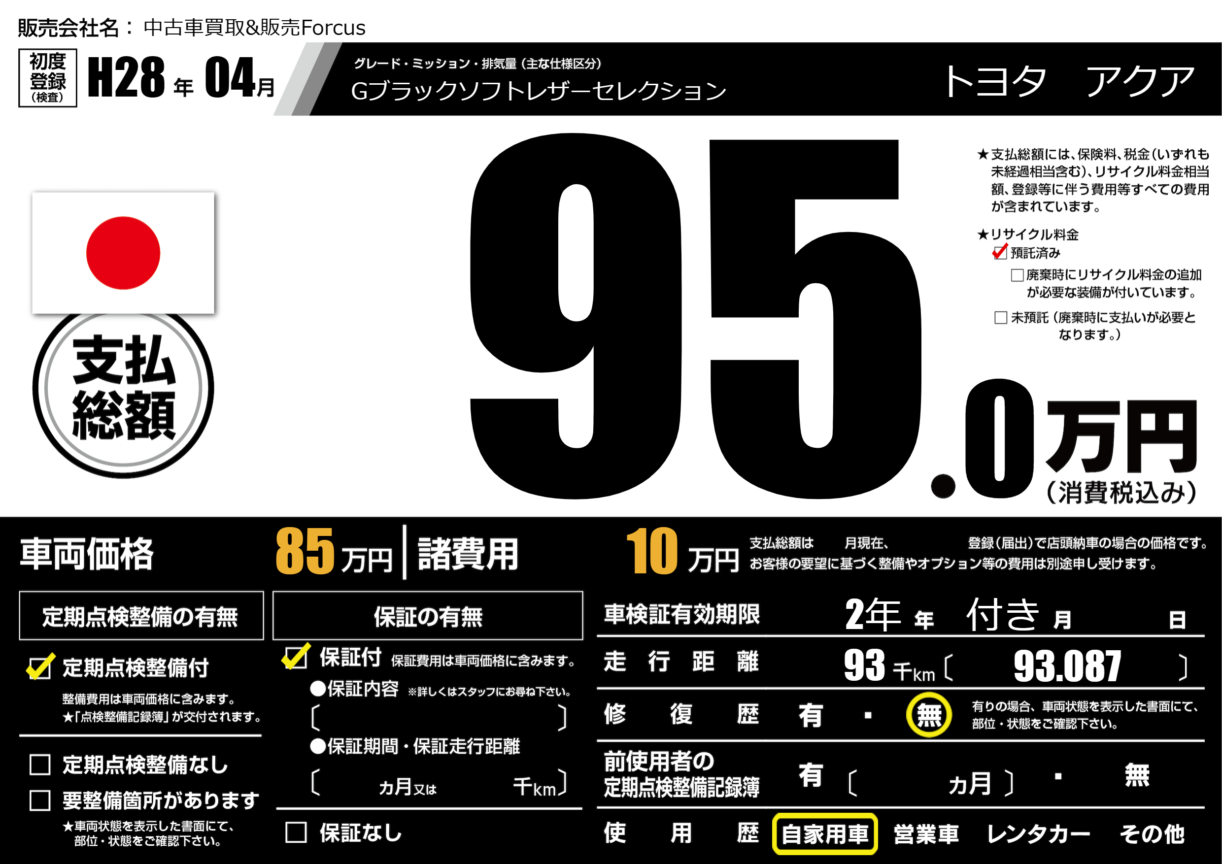 | 走行キロ | 9.3万km | 初年度登録 | H28年04月 |