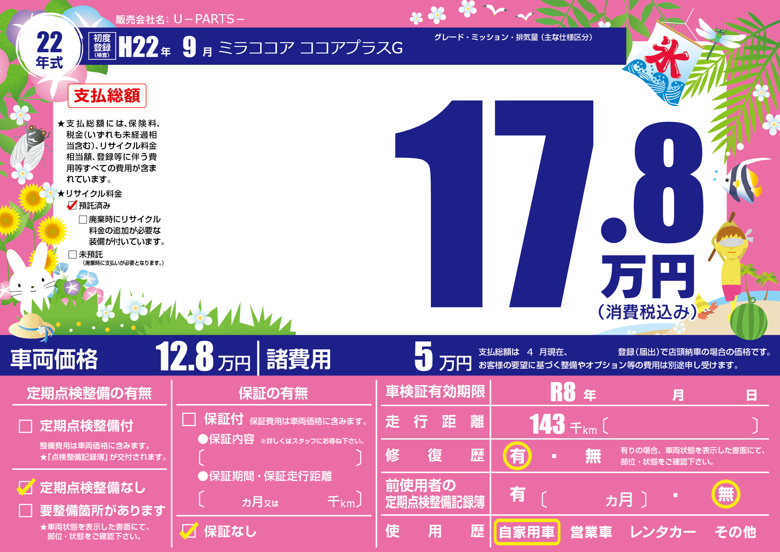 | 走行キロ | 14.3万km | 初年度登録 | H22年9月 |