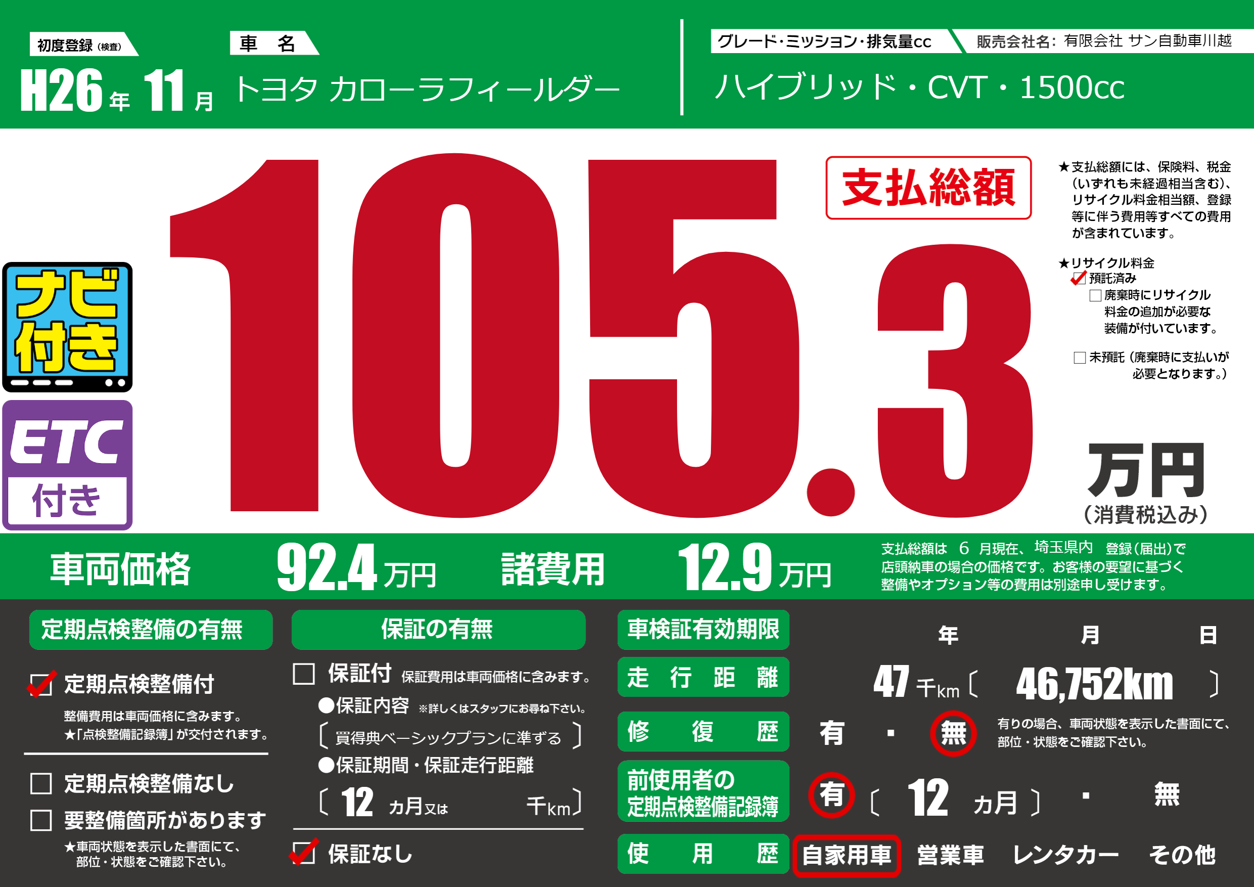 | 走行キロ | 4.7万km | 初年度登録 | H26年11月 |