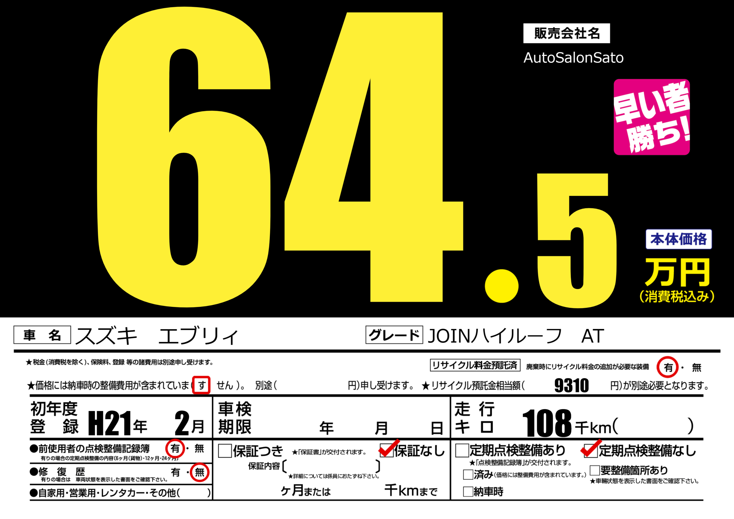 あり | リサイクル預託金相当額 | ( 9310円)が別途必要 |