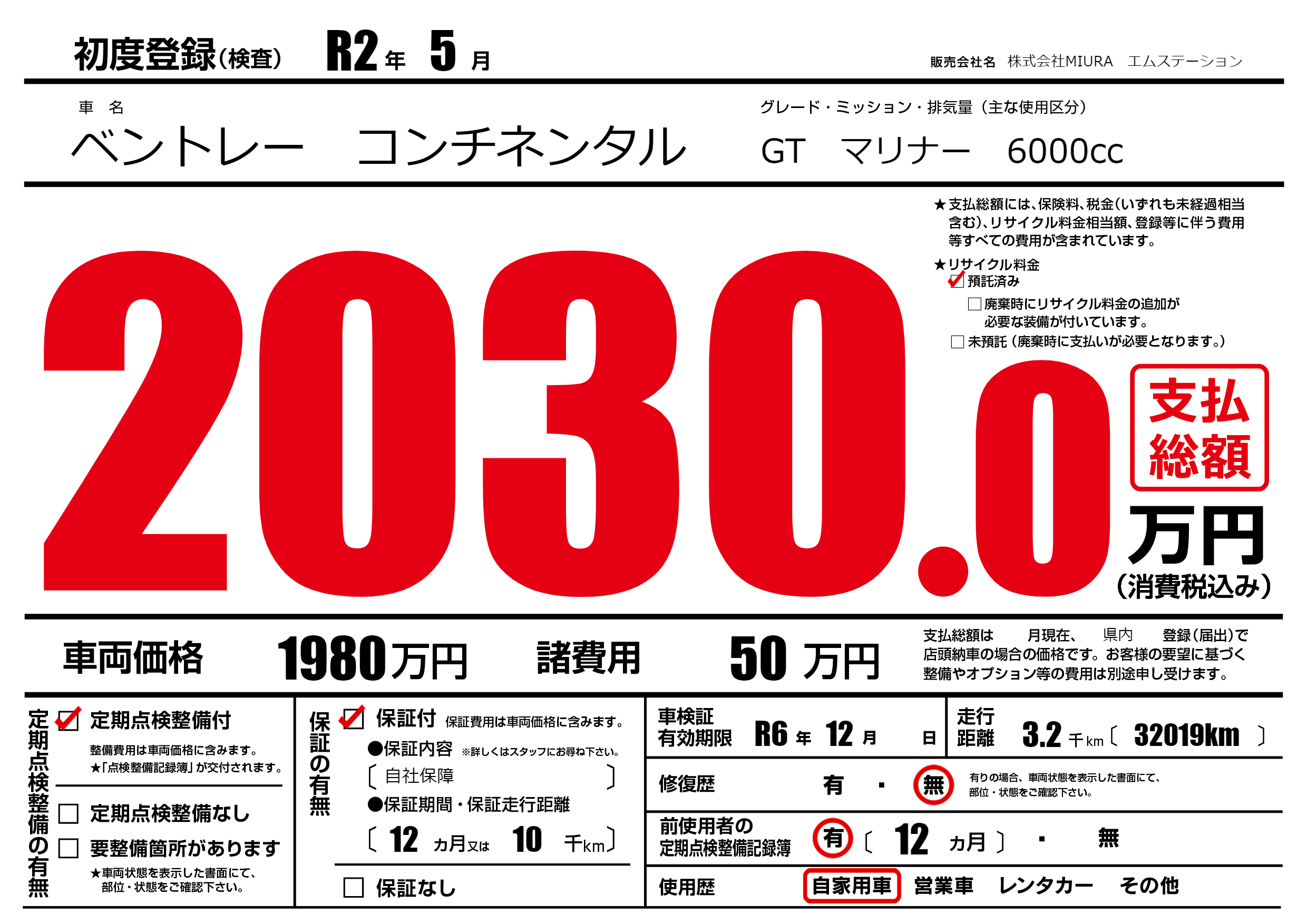 | 車名 | ベントレー コンチネンタル | グレード ミッション 排気量 |