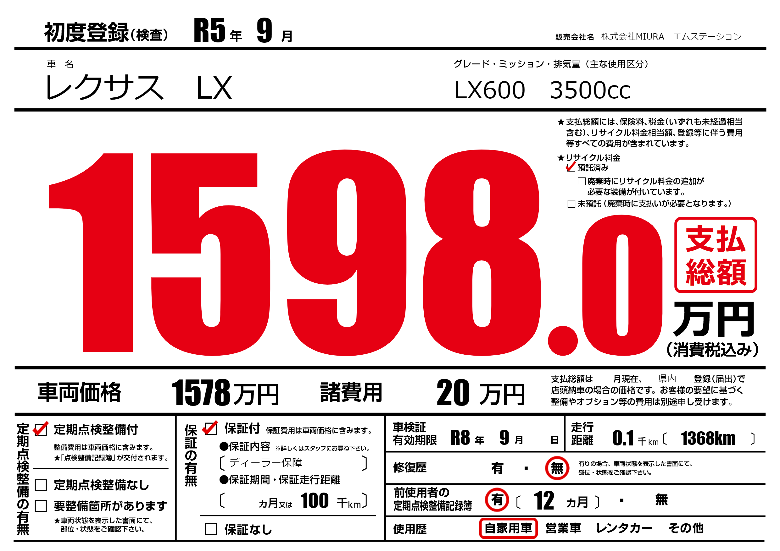 | 車名 | レクサス LX | グレード ミッション 排気量 |