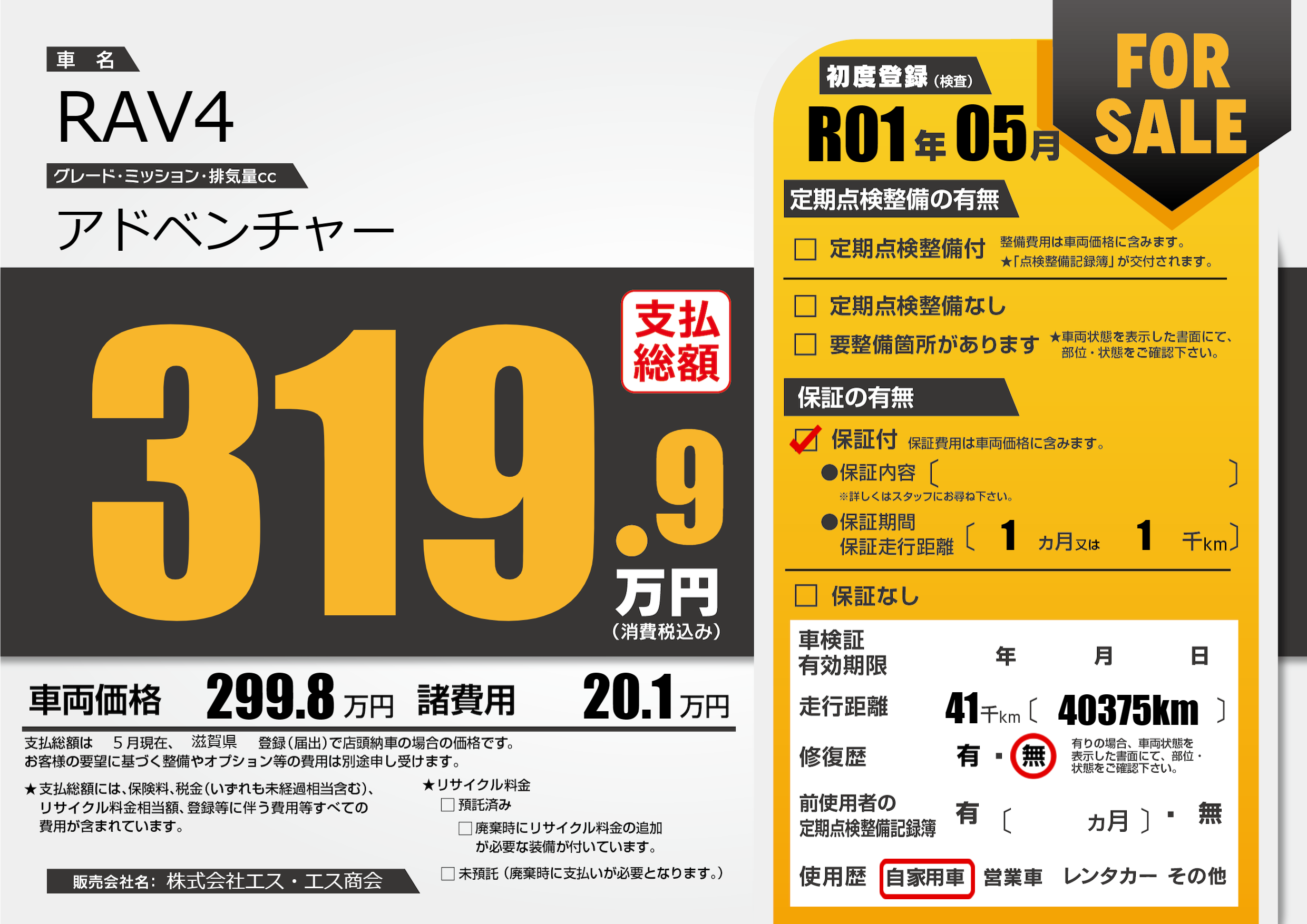 | 走行キロ | 4.1万km | 初年度登録 | R01年05月 |