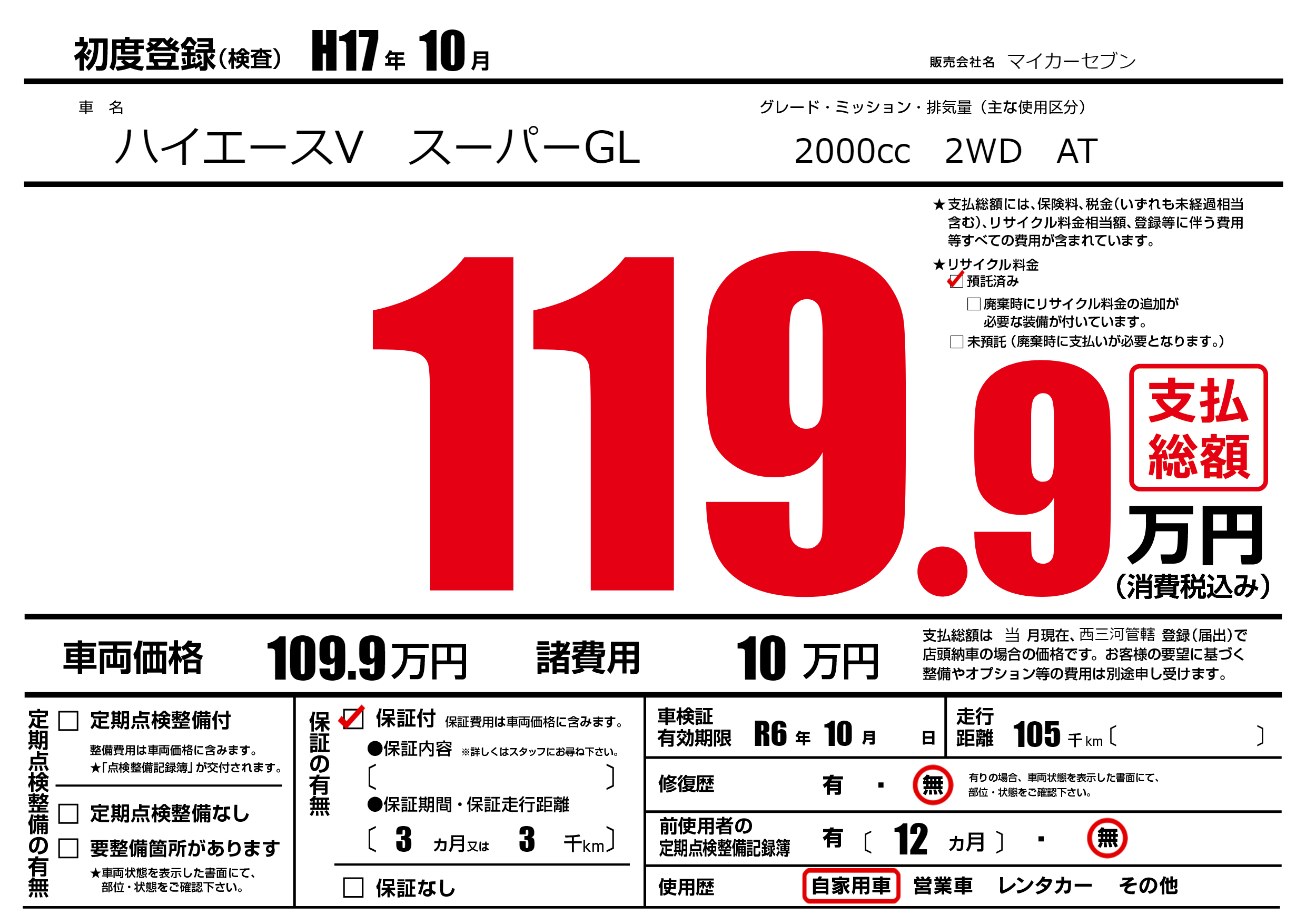 | 走行キロ | 10.5万km | 初年度登録 | H17年10月 |
