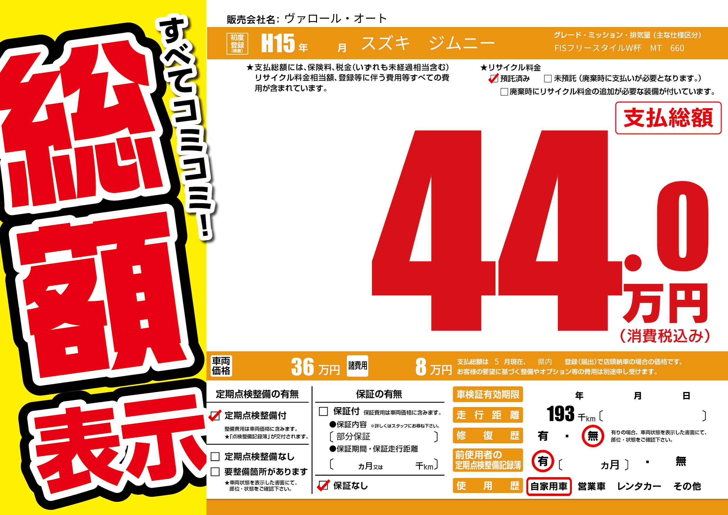 | 車名 | スズキ ジムニー | グレード ミッション 排気量 |