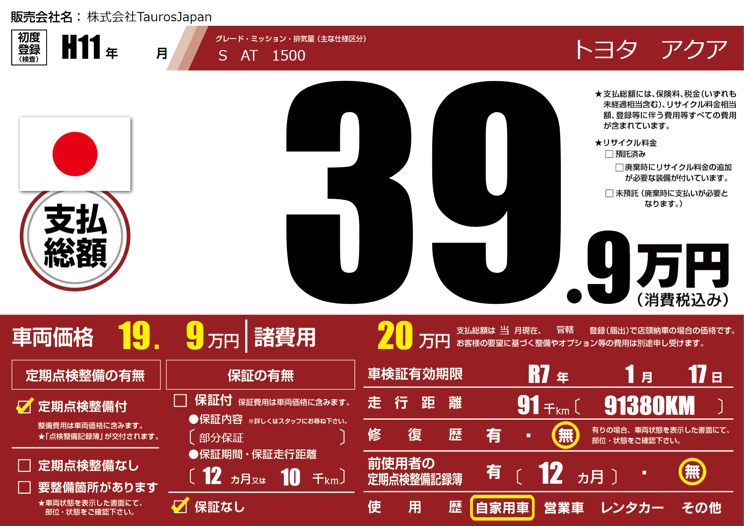 | 走行キロ | 9.1万km | ||
