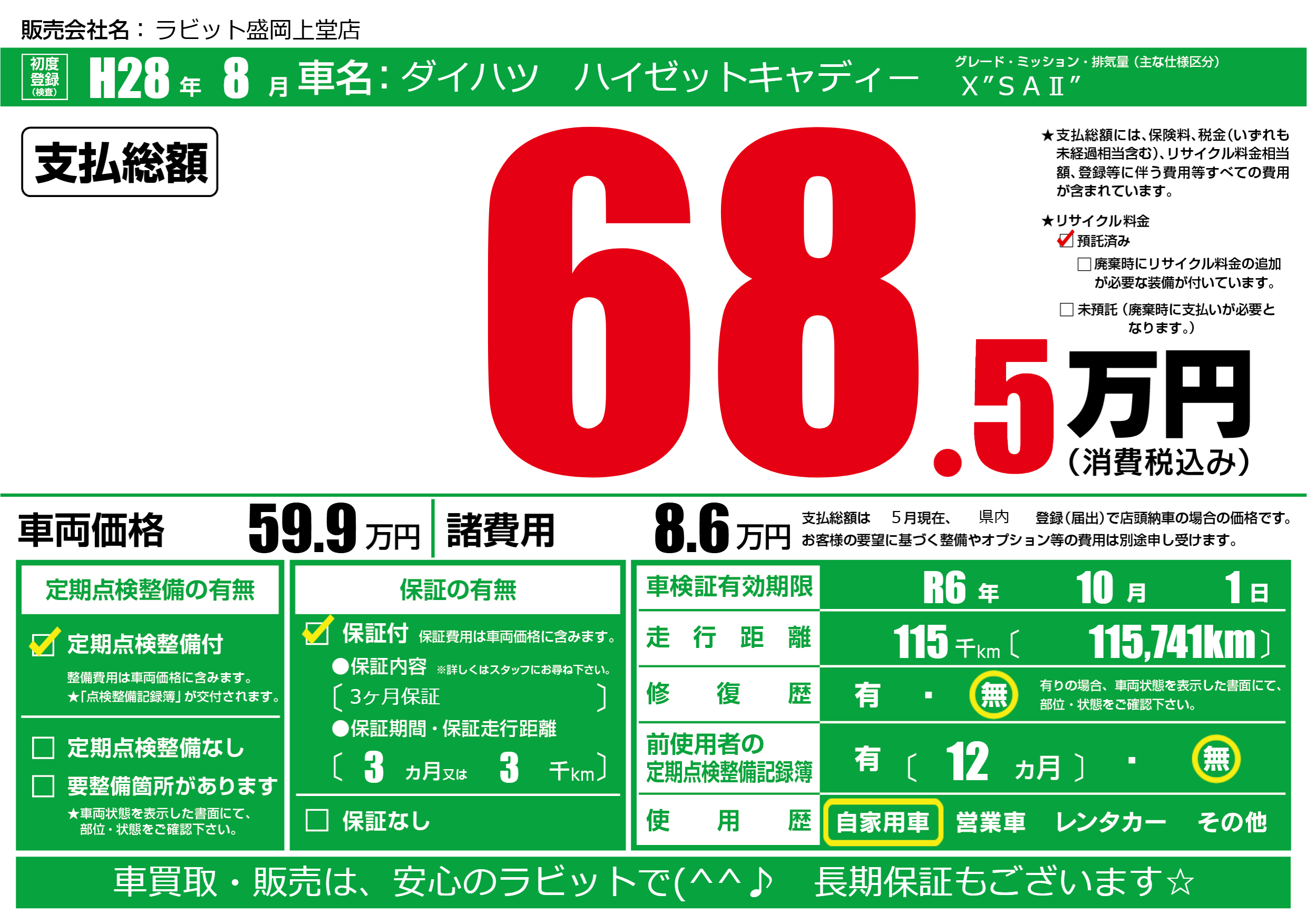 | 走行キロ | 11.5万km | 初年度登録 | H28年8月 |