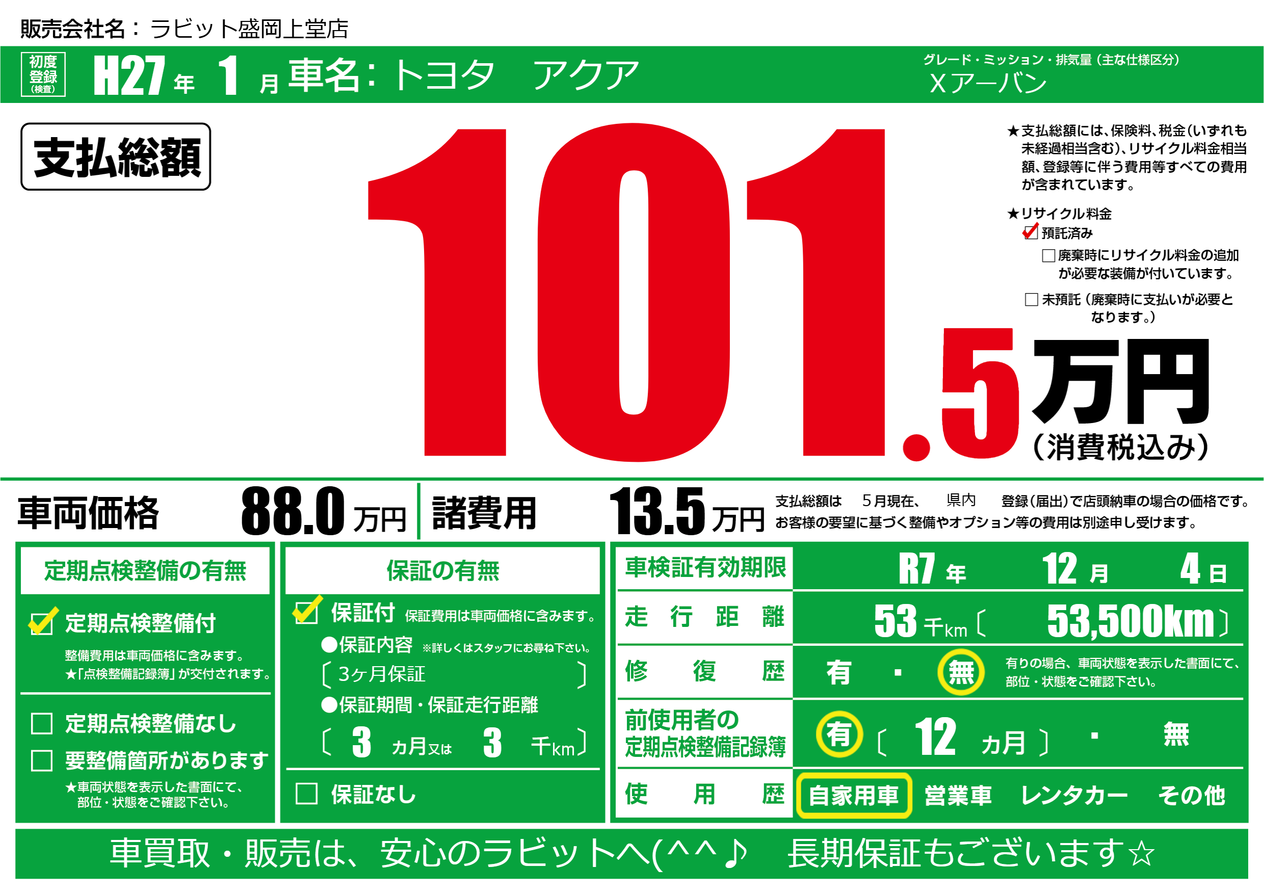 保証付き 保証内容(3ヶ月保証) 3ヶ月または(3)千kmまで |