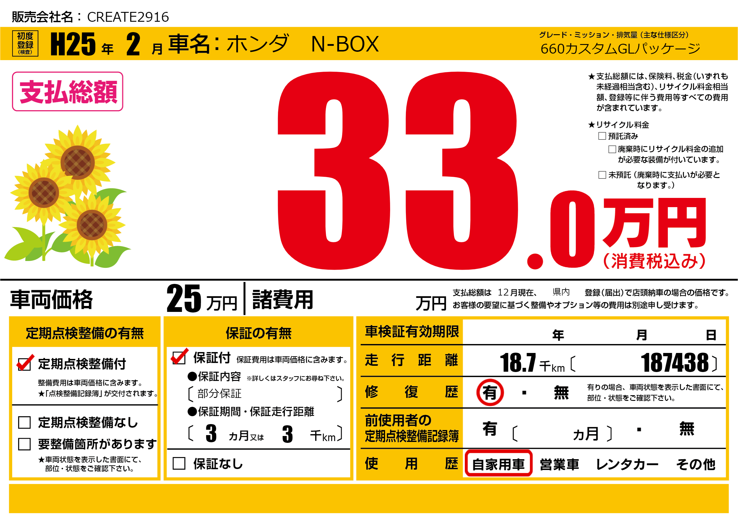 | 車名 | ホンダ N-BOX | グレード ミッション 排気量 |