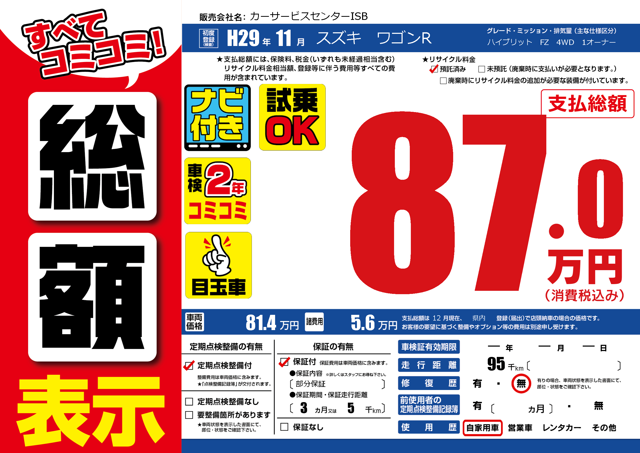 | 車名 | スズキ ワゴンR | グレード ミッション 排気量 |