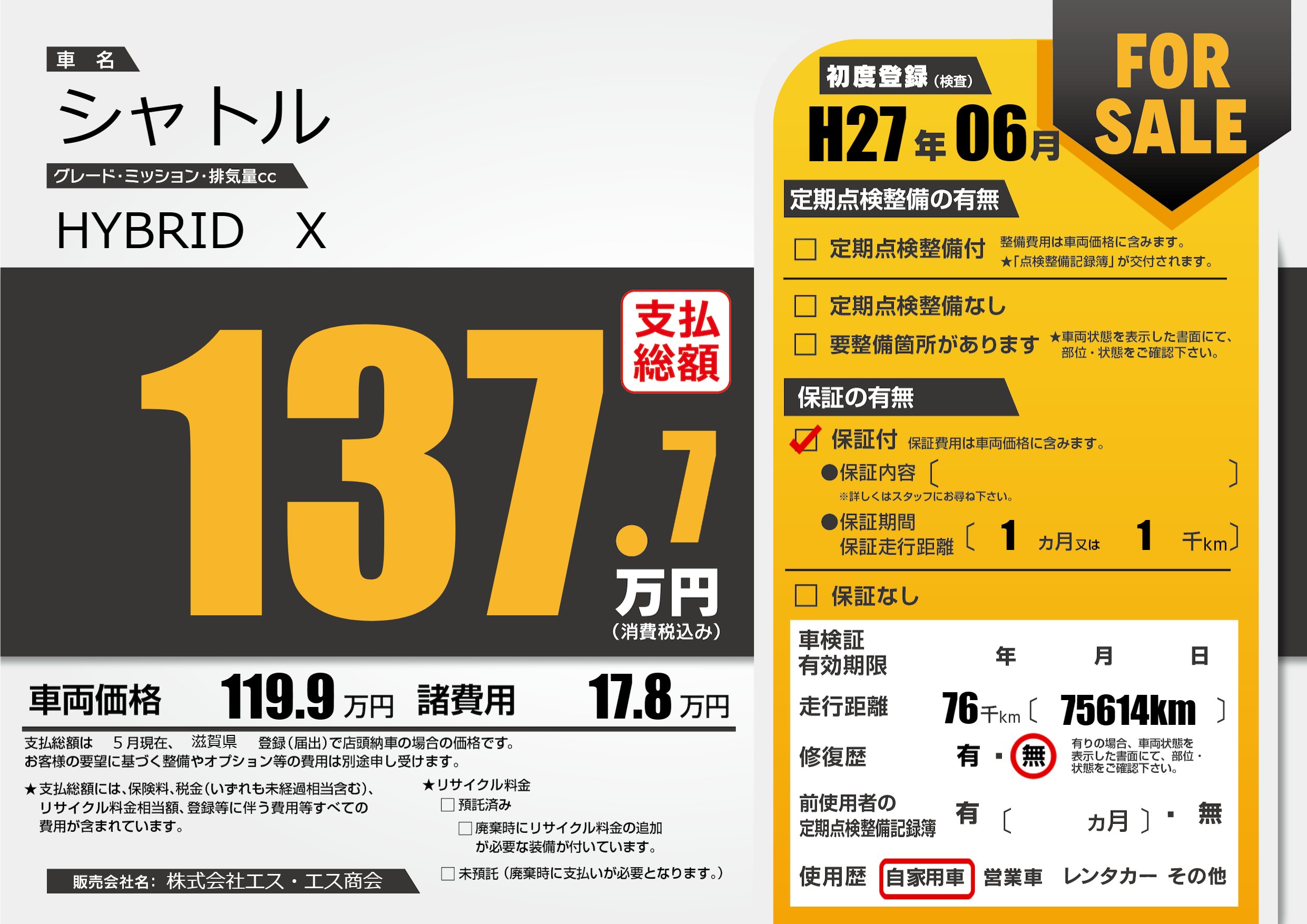 | 走行キロ | 7.6万km | 初年度登録 | H27年06月 |