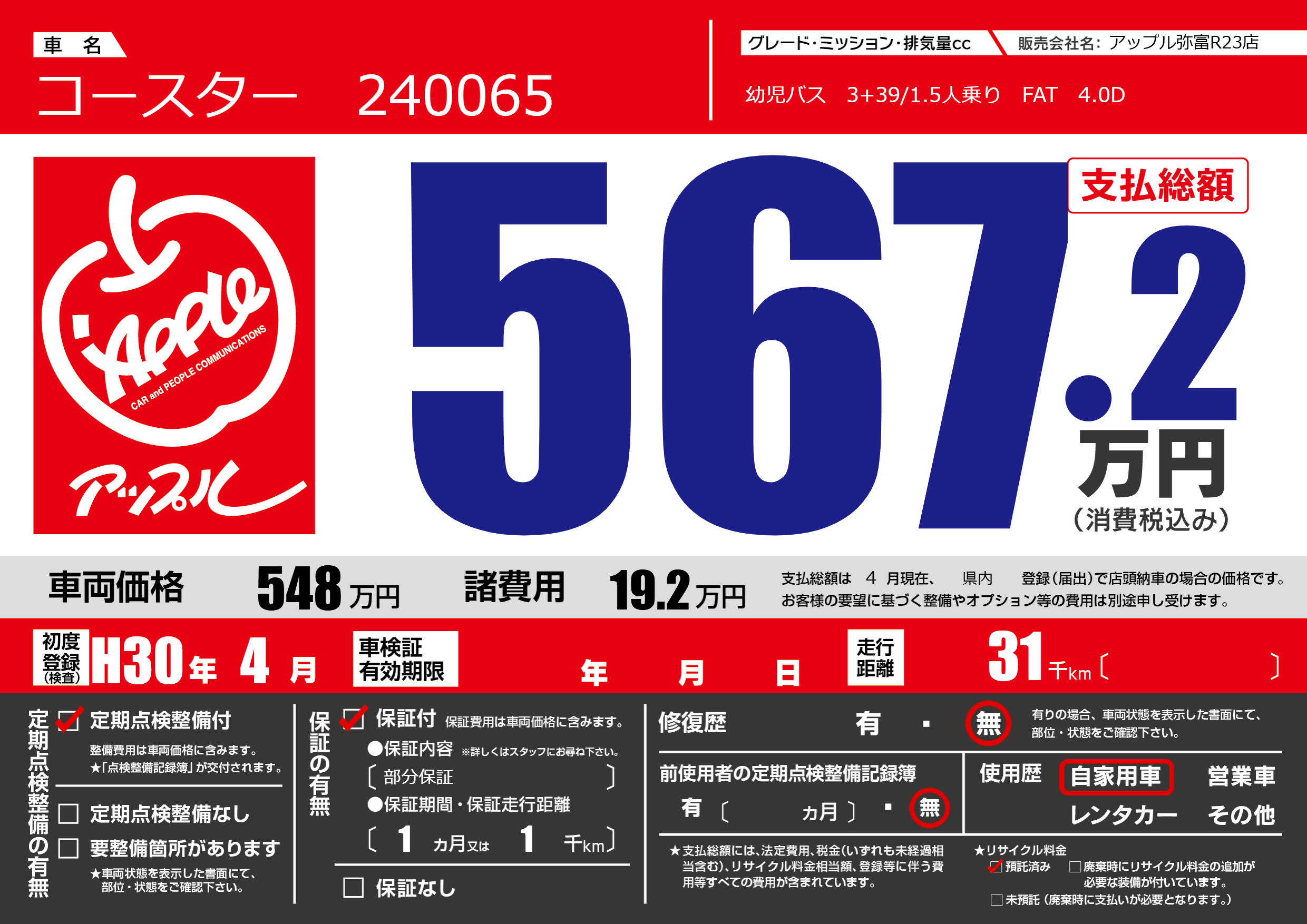 | 車名 | コースター 240065 | グレード ミッション 排気量 |