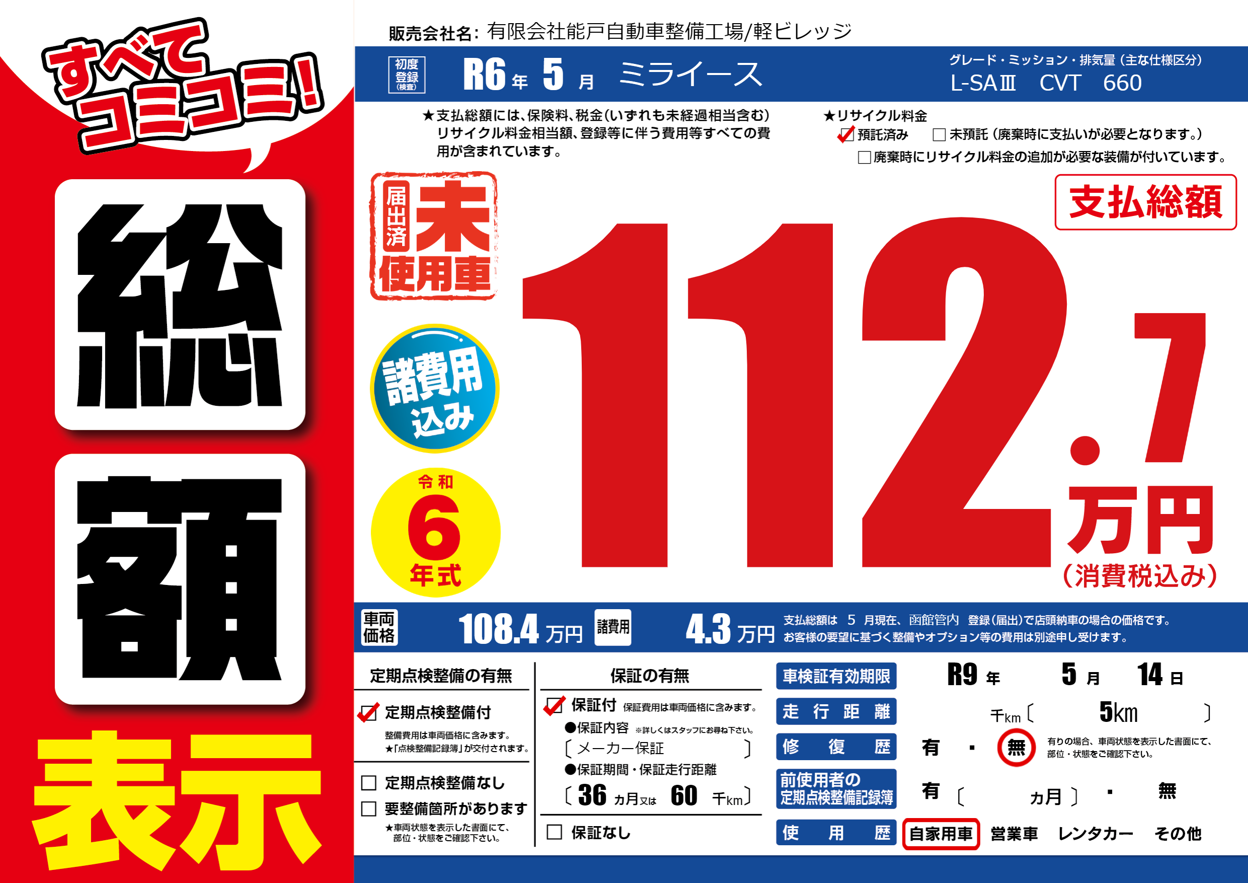 | 車名 | ミライース | グレード ミッション 排気量 |
