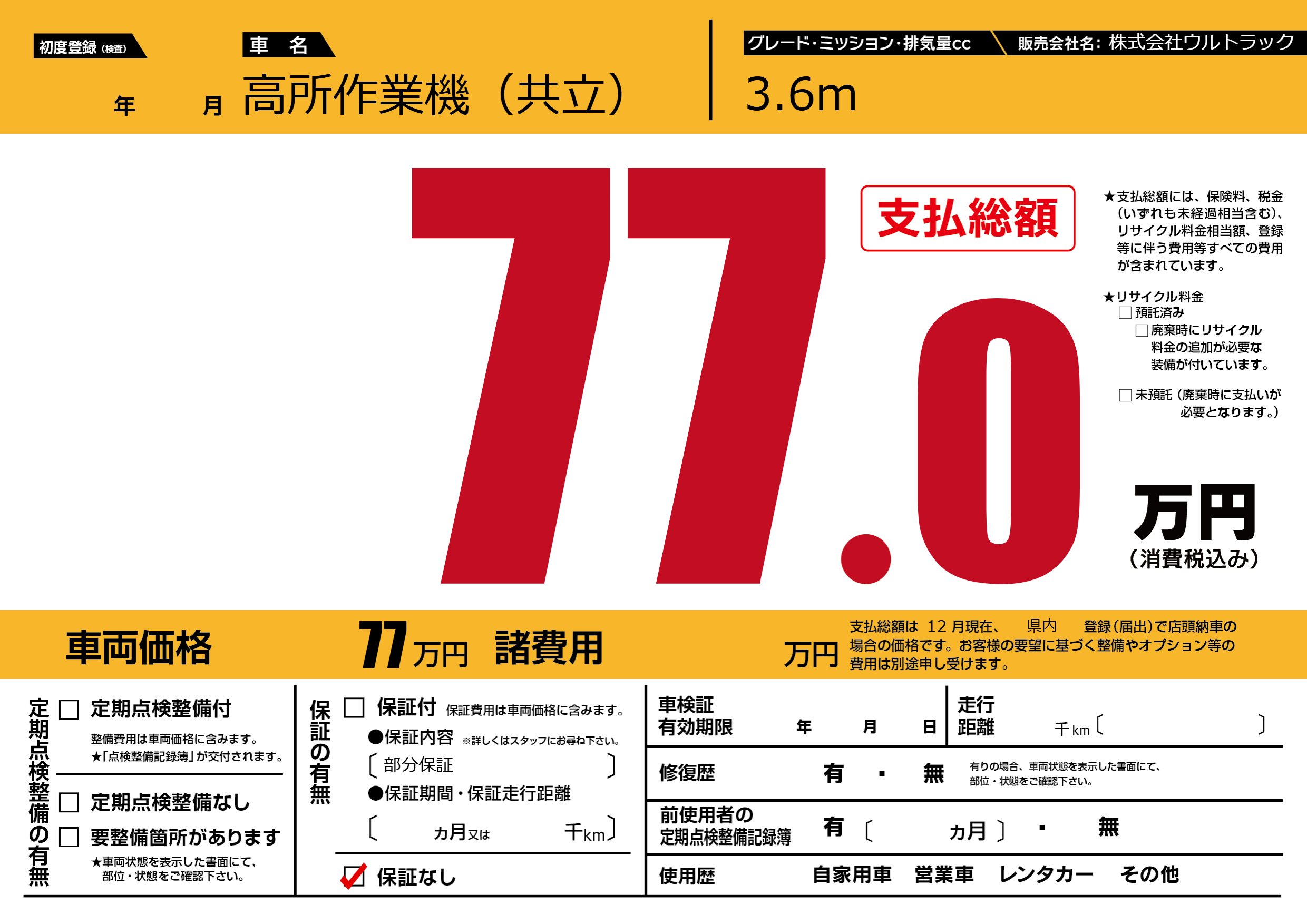 保証なし 保証内容(部分保証) ---ヶ月または()千kmまで |