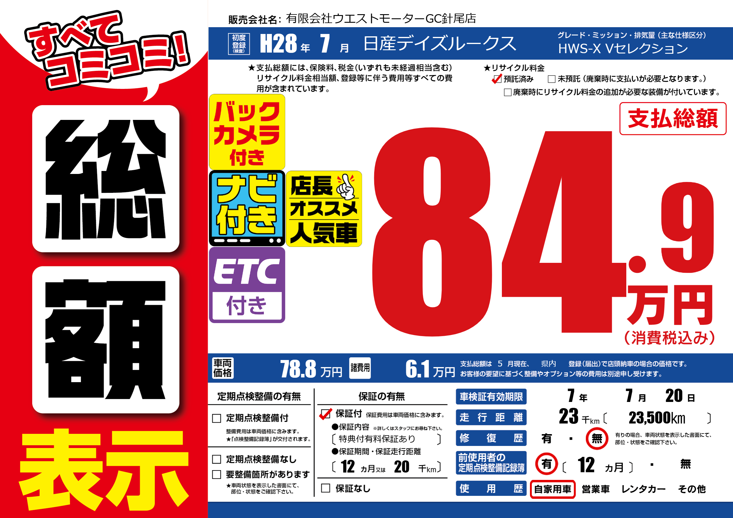 | 走行キロ | 2.3万km | 初年度登録 | H28年7月 |