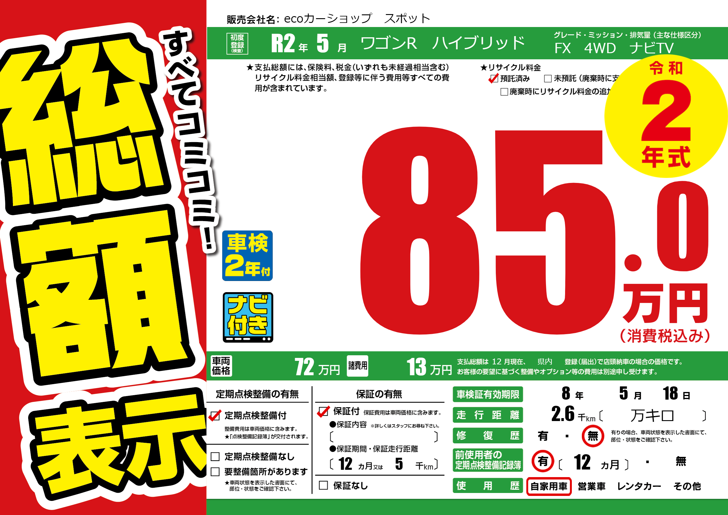 | 車名 | ワゴンR ハイブリッド | グレード ミッション 排気量 |