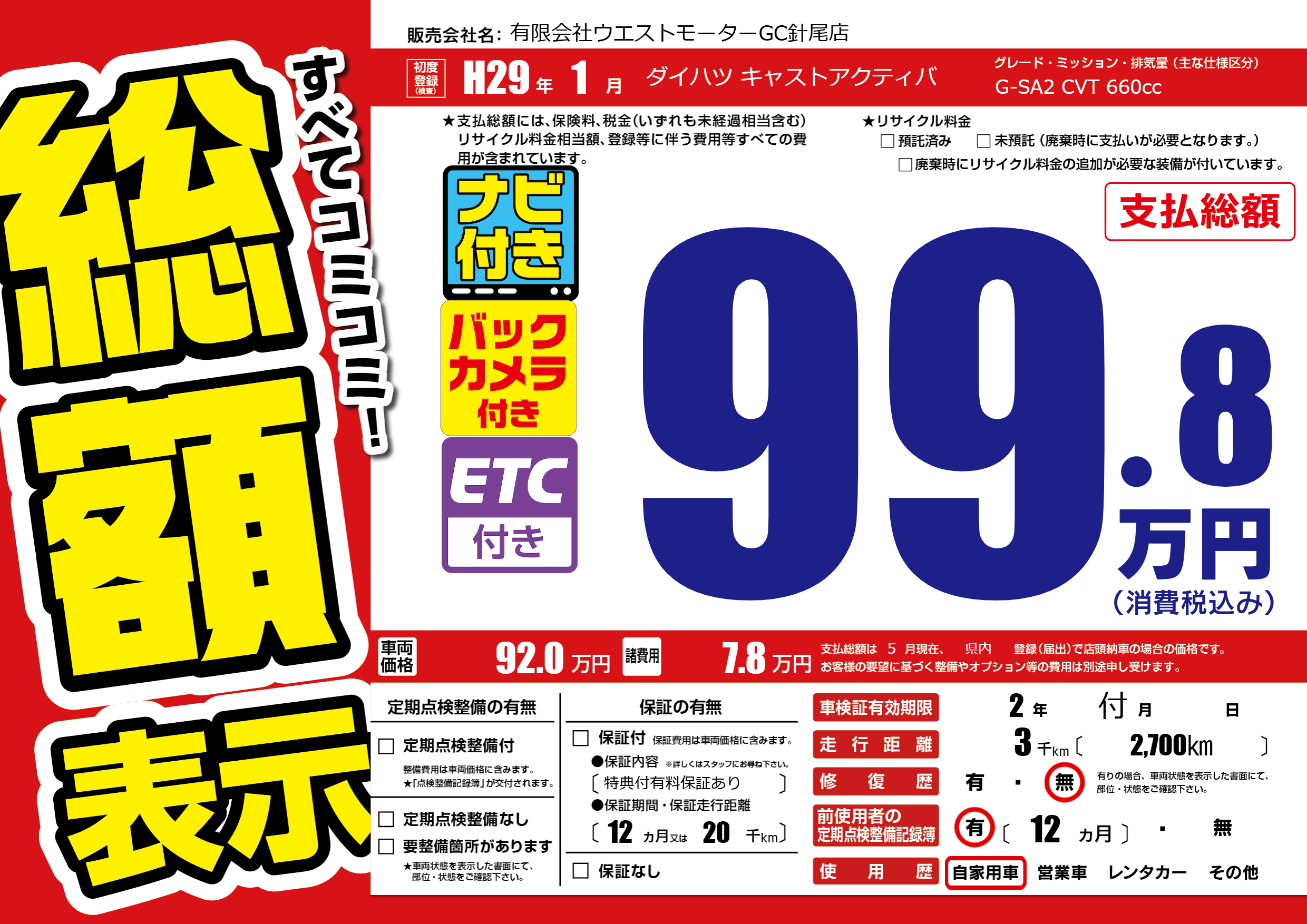 | 車名 | ダイハツ キャストアクティバ | グレード ミッション 排気量 |