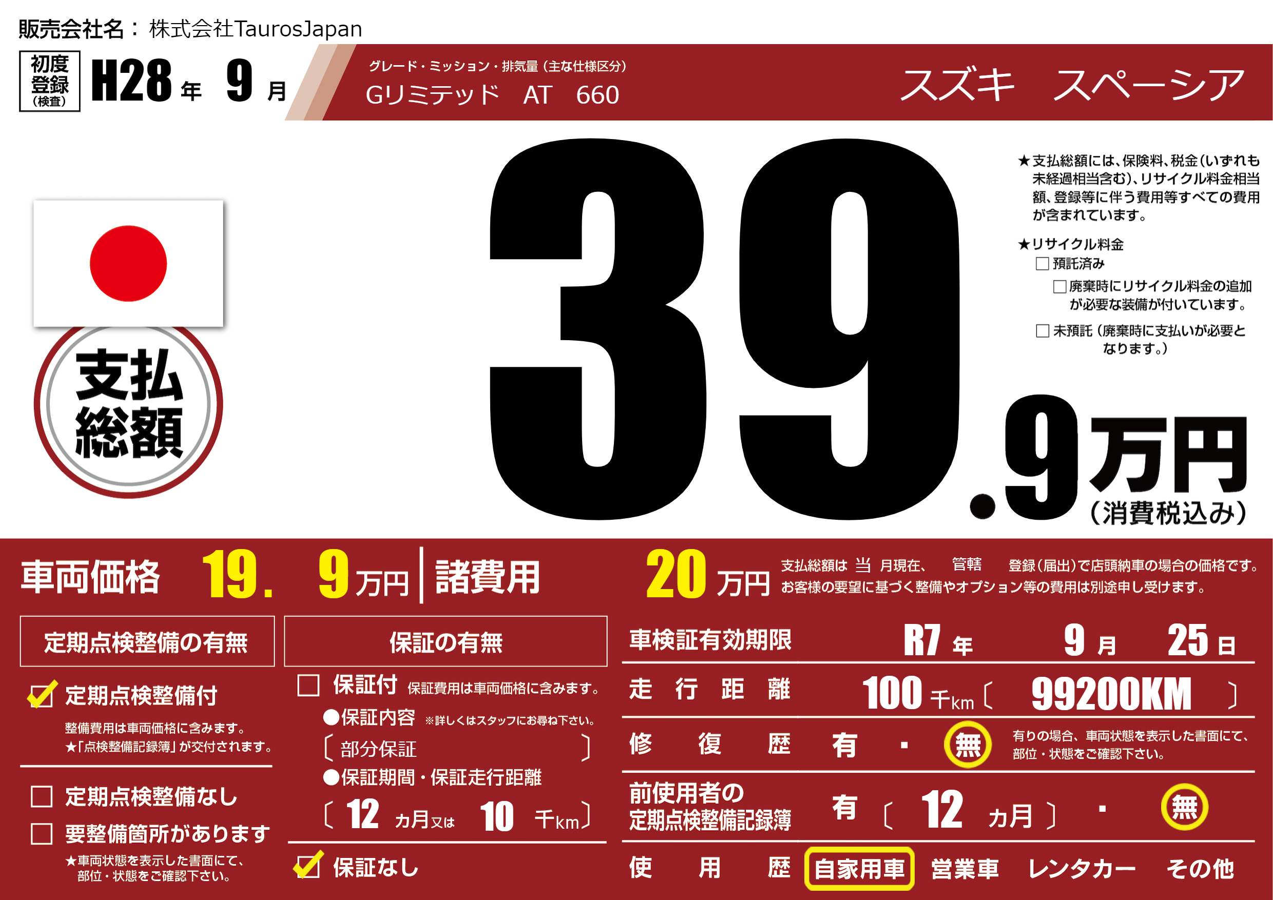 | 走行キロ | 10万km | 初年度登録 | H28年9月 |