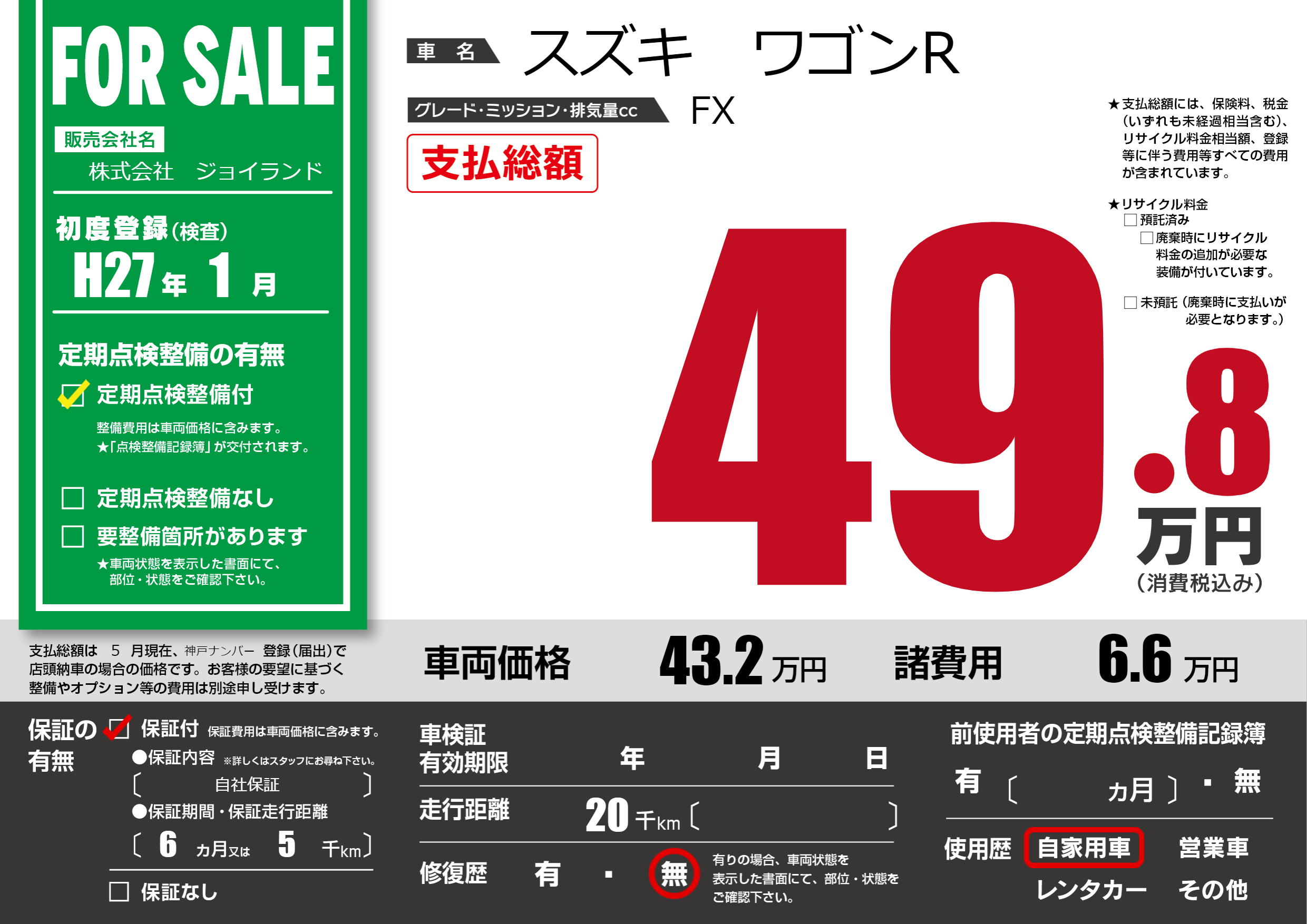 保証付き 保証内容( 自社保証) 6ヶ月または(5)千kmまで |