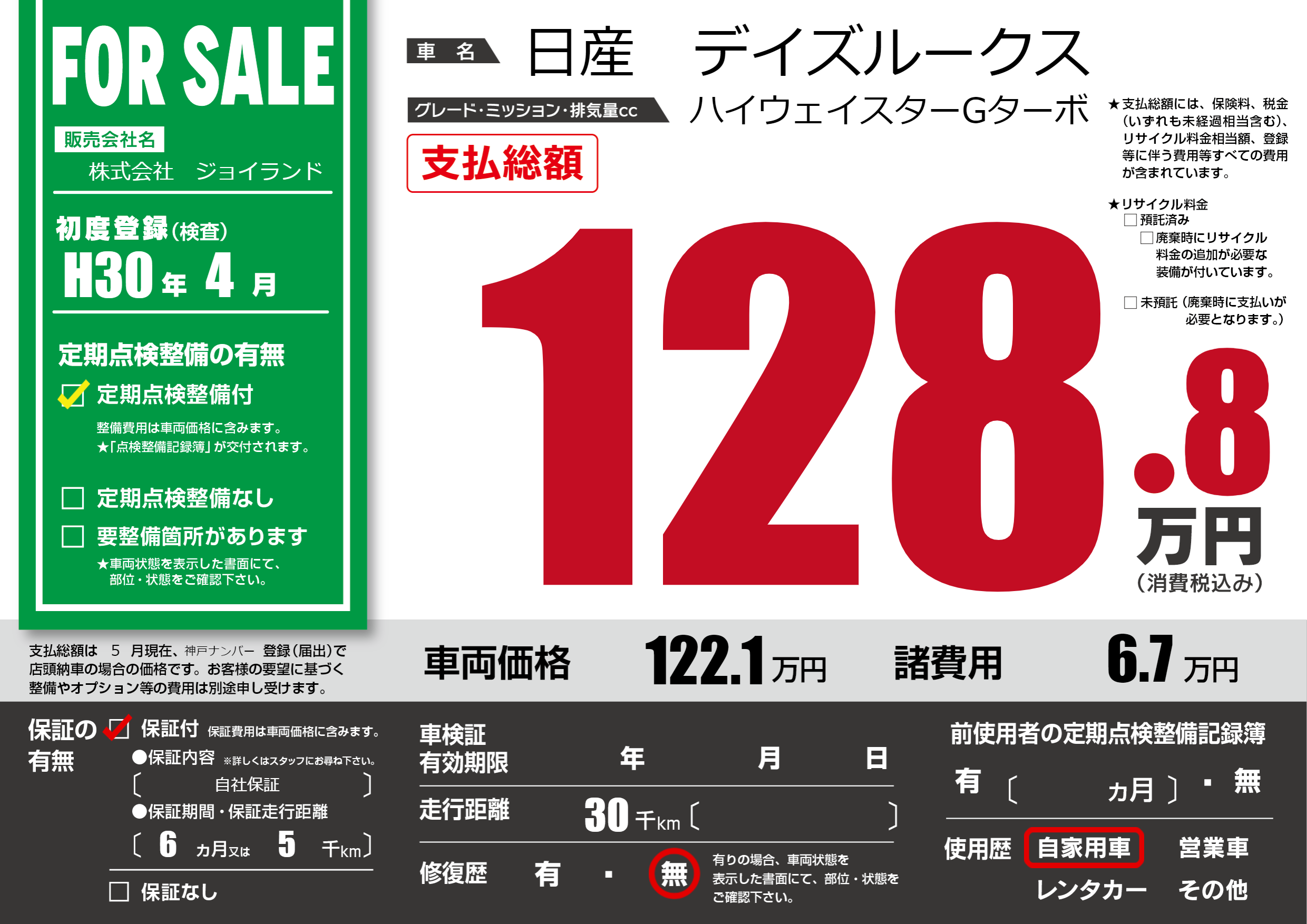 | 走行キロ | 3万km | 初年度登録 | H30年4月 |