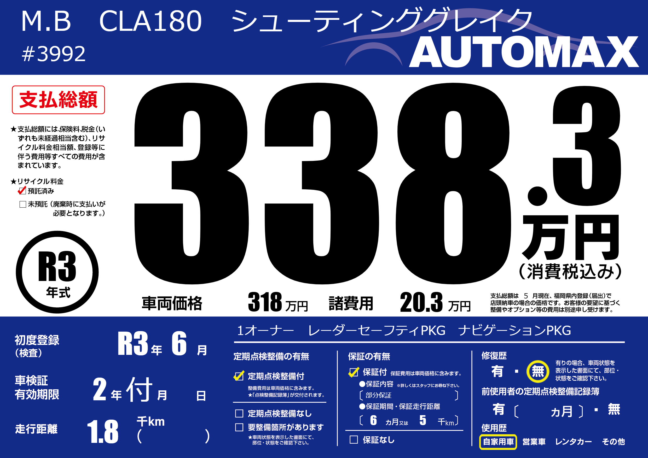 | 車名 | M.B CLA180 シューティンググレイク | グレード ミッション 排気量 |