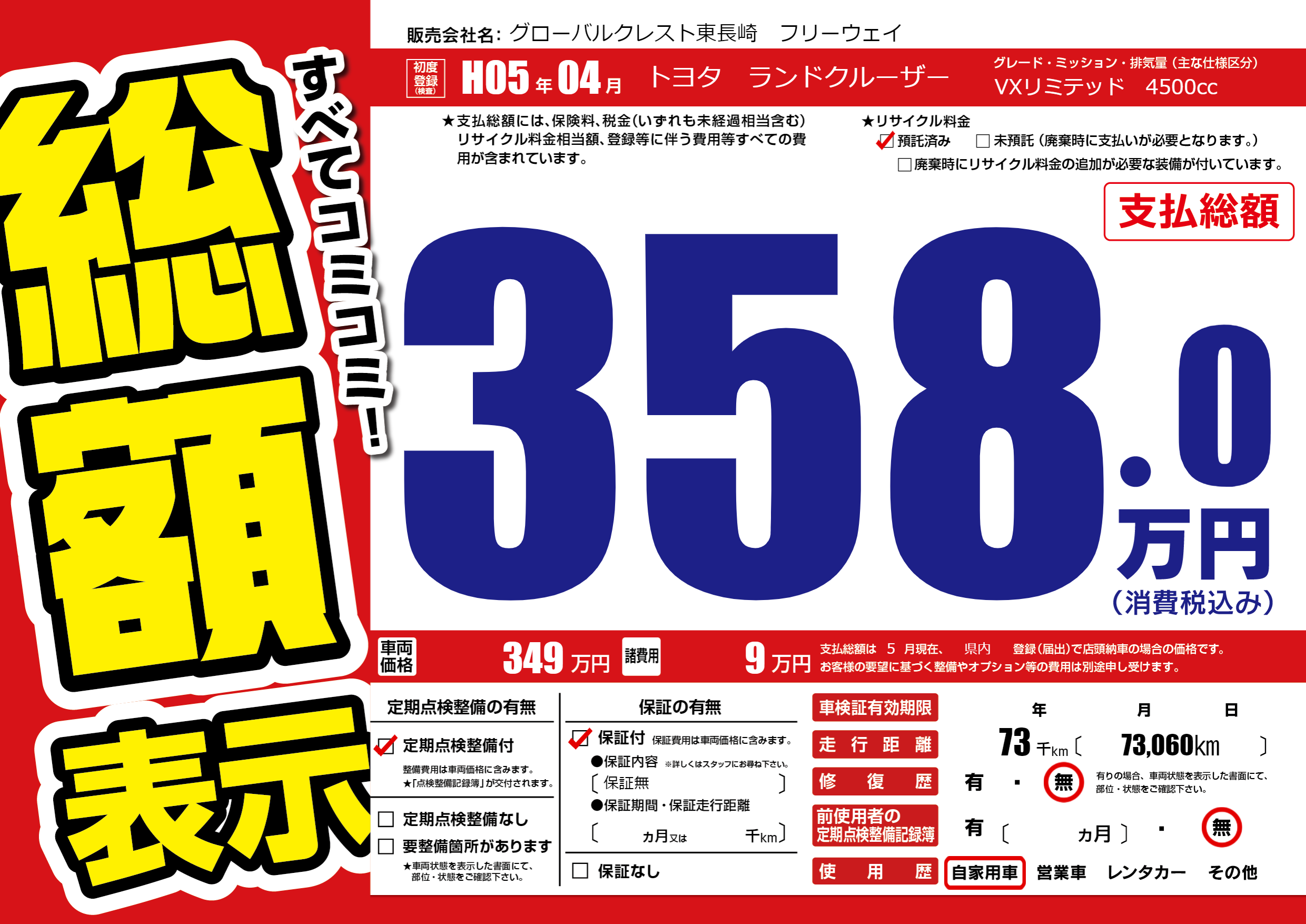 | 走行キロ | 7.3万km | 初年度登録 | H05年04月 |