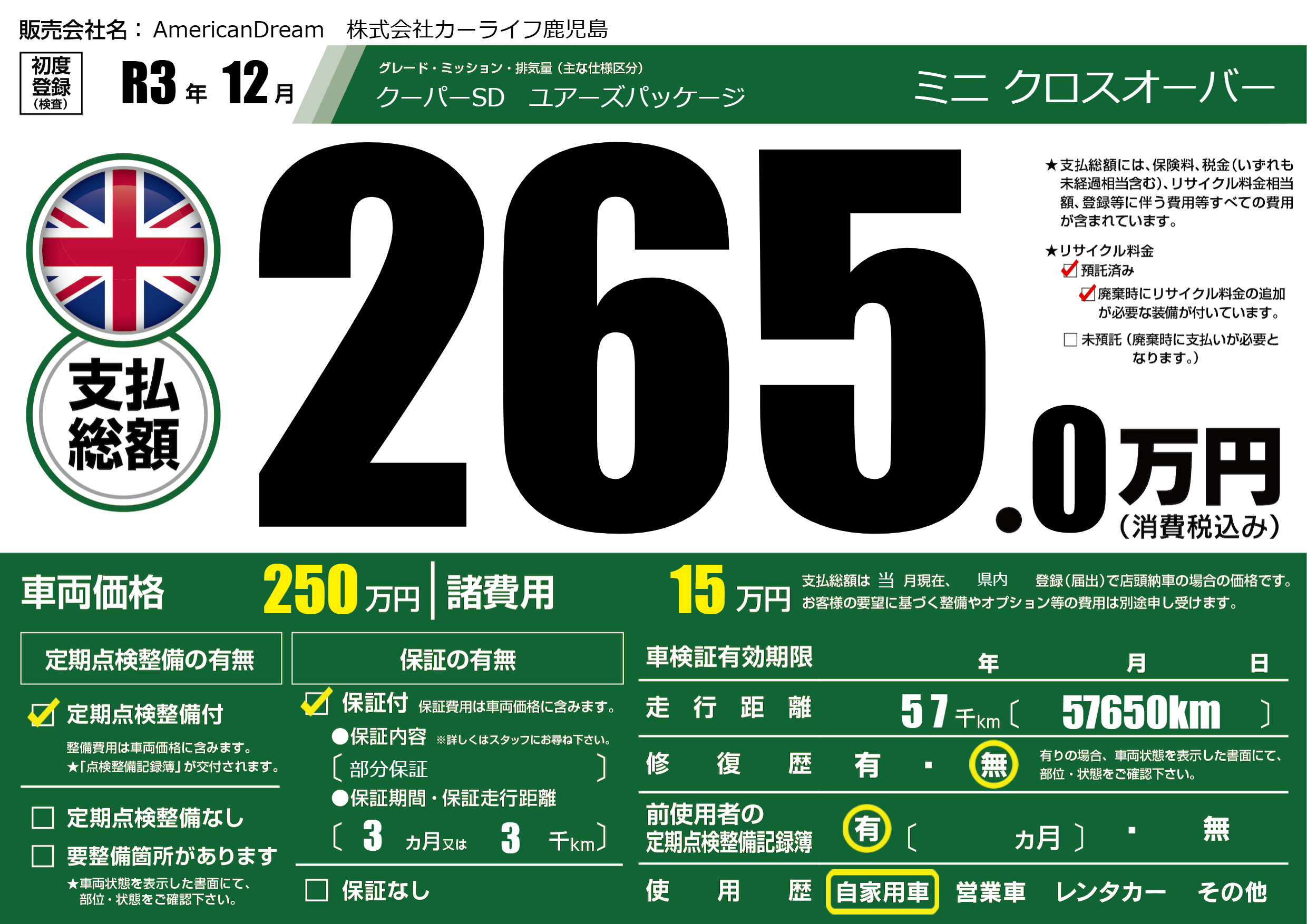 | 車検制限 | - 年 - 月 - 日 | ||