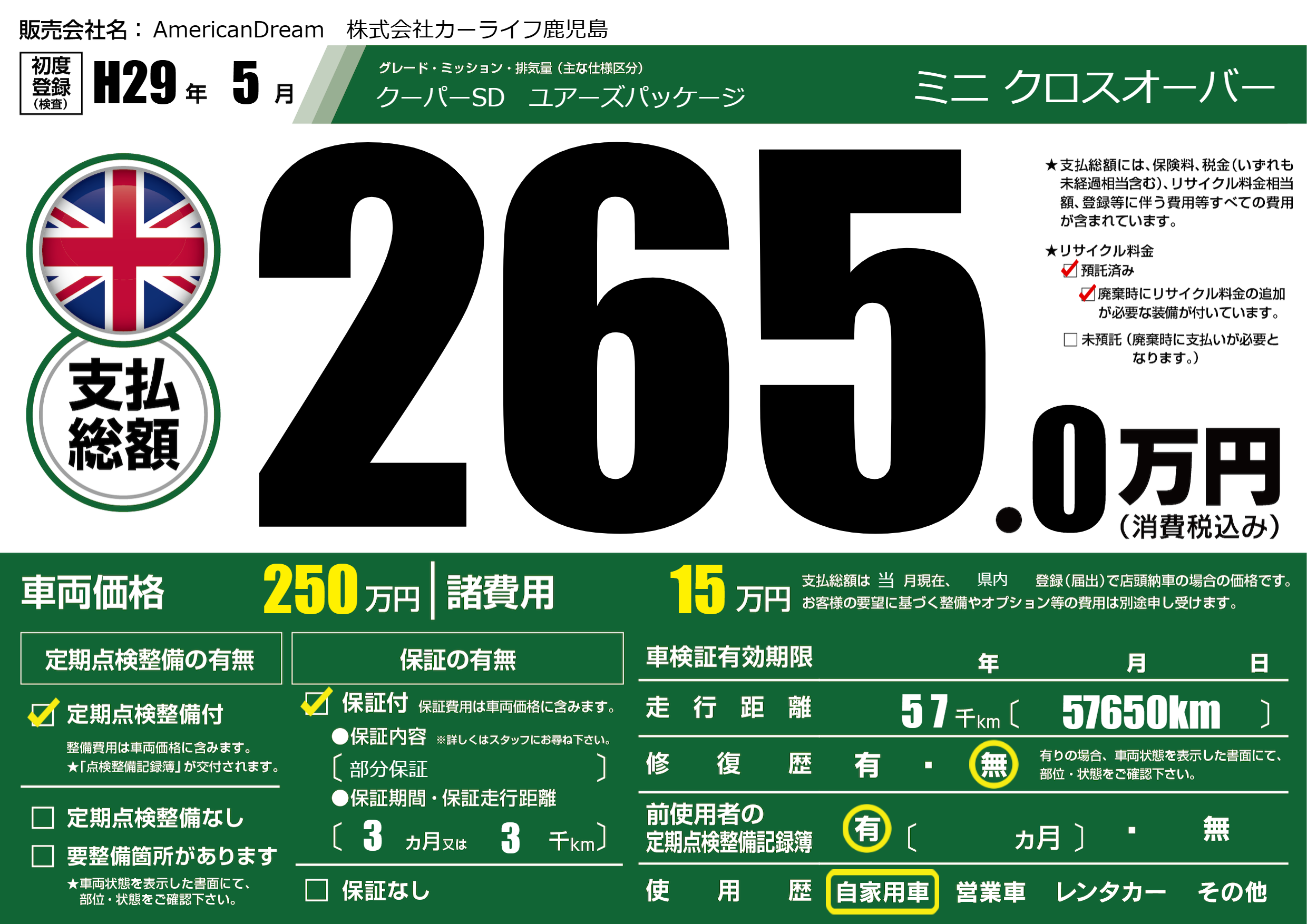 | 車検制限 | - 年 - 月 - 日 | ||