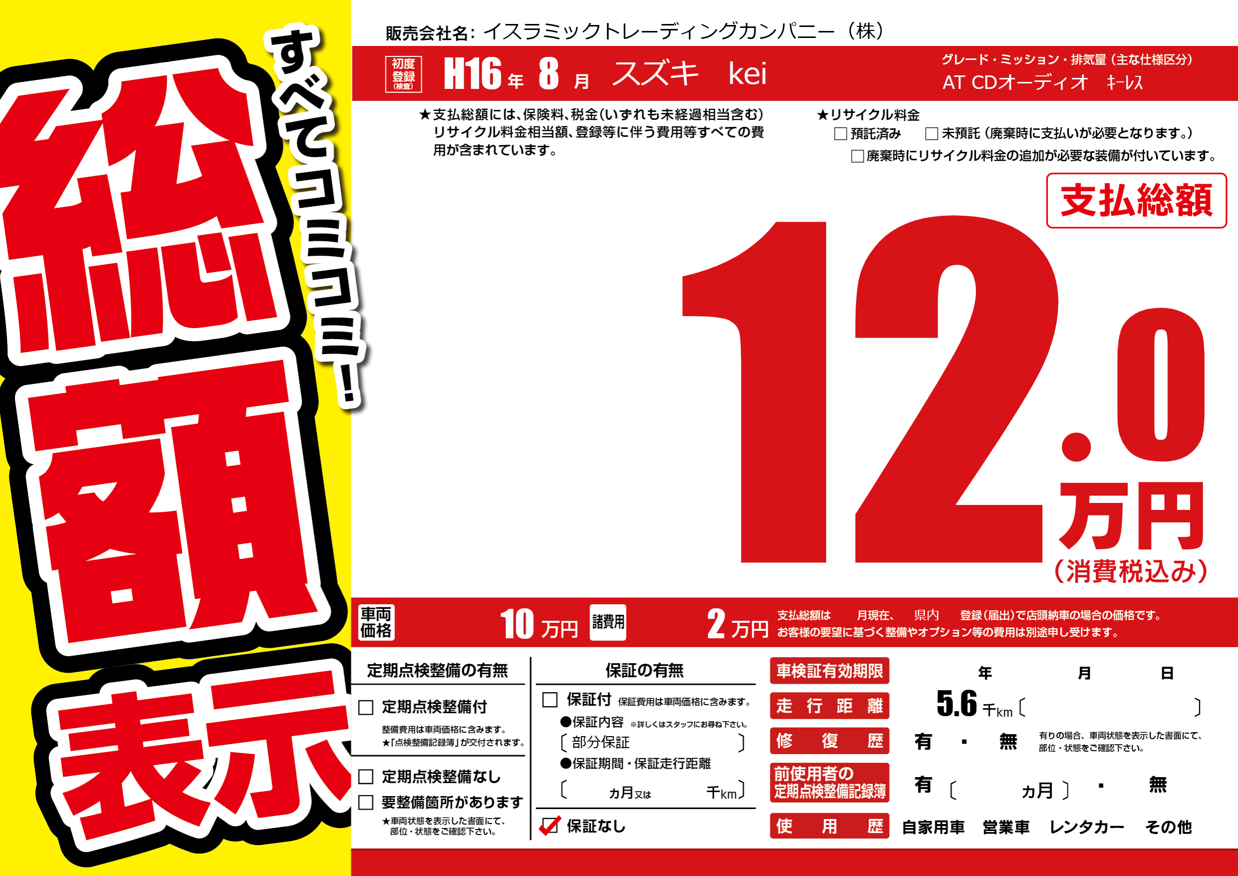 | 車名 | スズキ kei | グレード ミッション 排気量 |