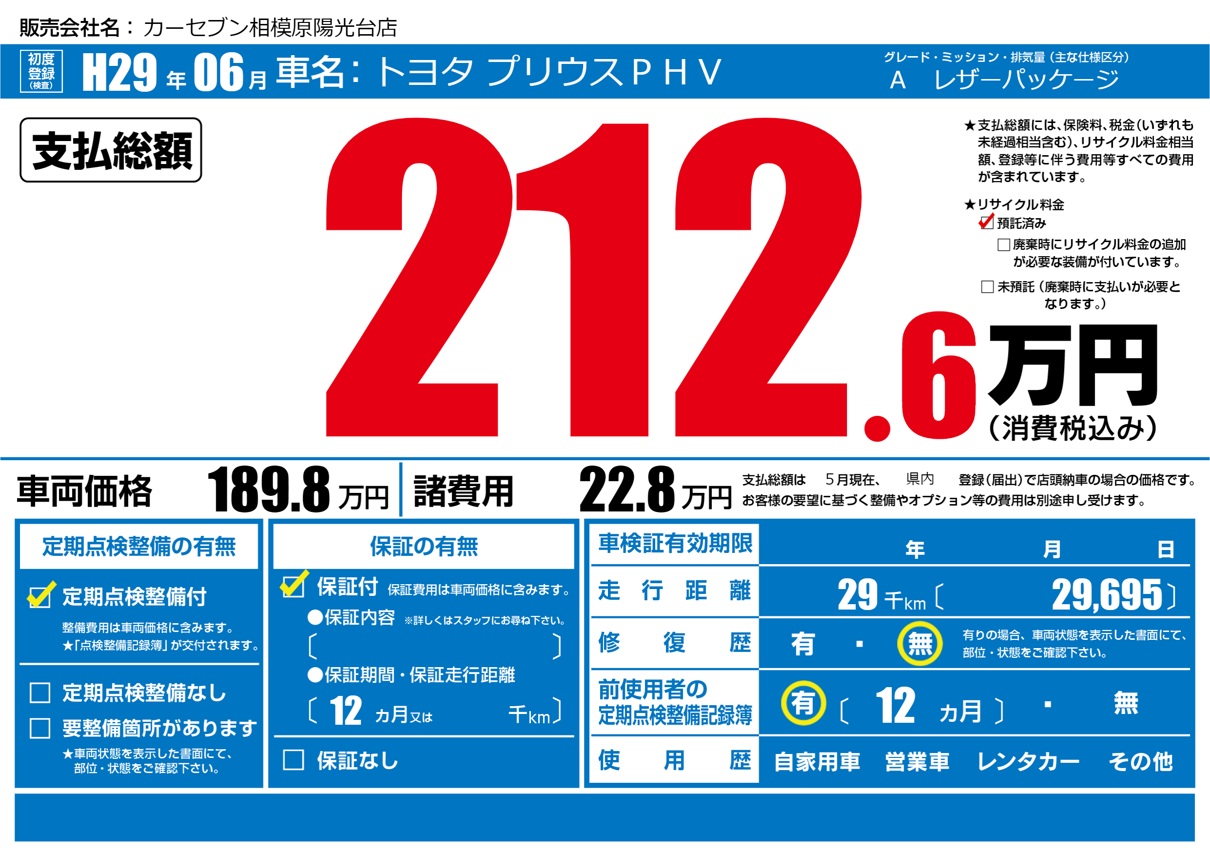 | 車名 | トヨタ プリウスPHV | グレード ミッション 排気量 |