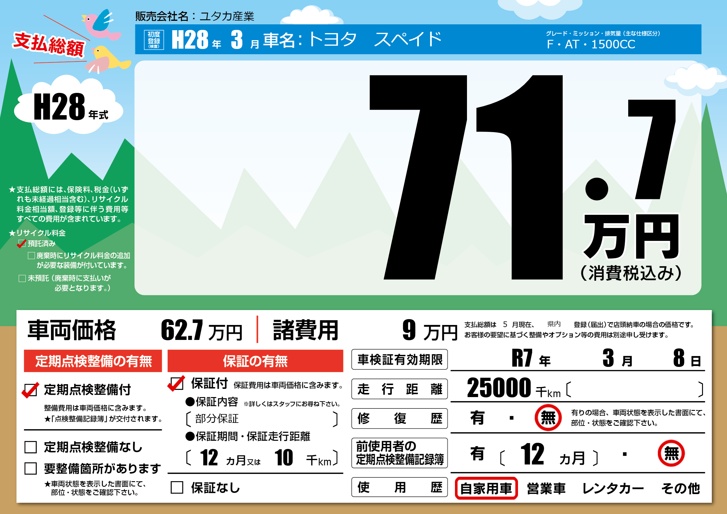 | 車名 | トヨタ スペイド | グレード ミッション 排気量 |
