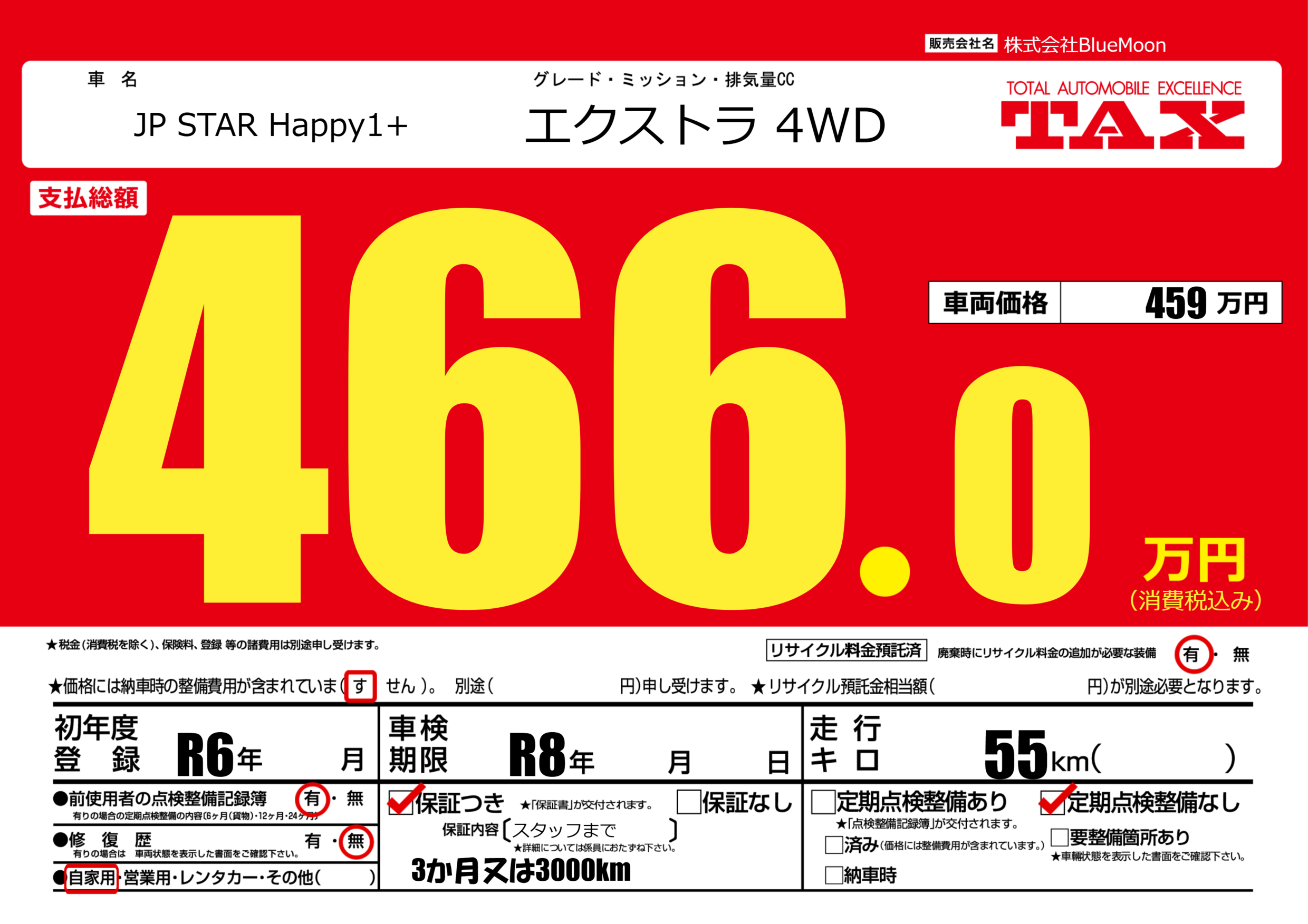 | 車名 | JP STAR Happy1+ | グレード ミッション 排気量 |