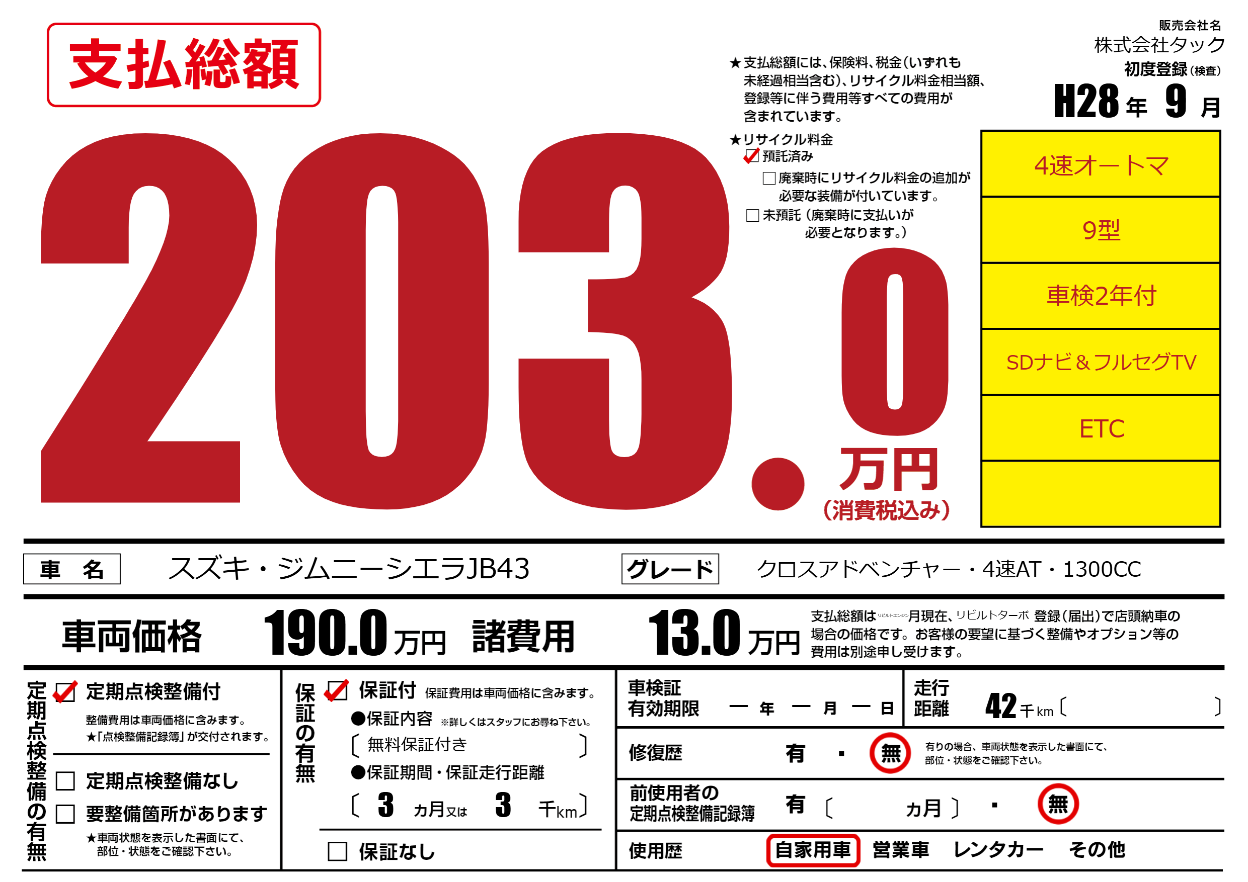 | 走行キロ | 4.2万km | 初年度登録 | H28年9月 |
