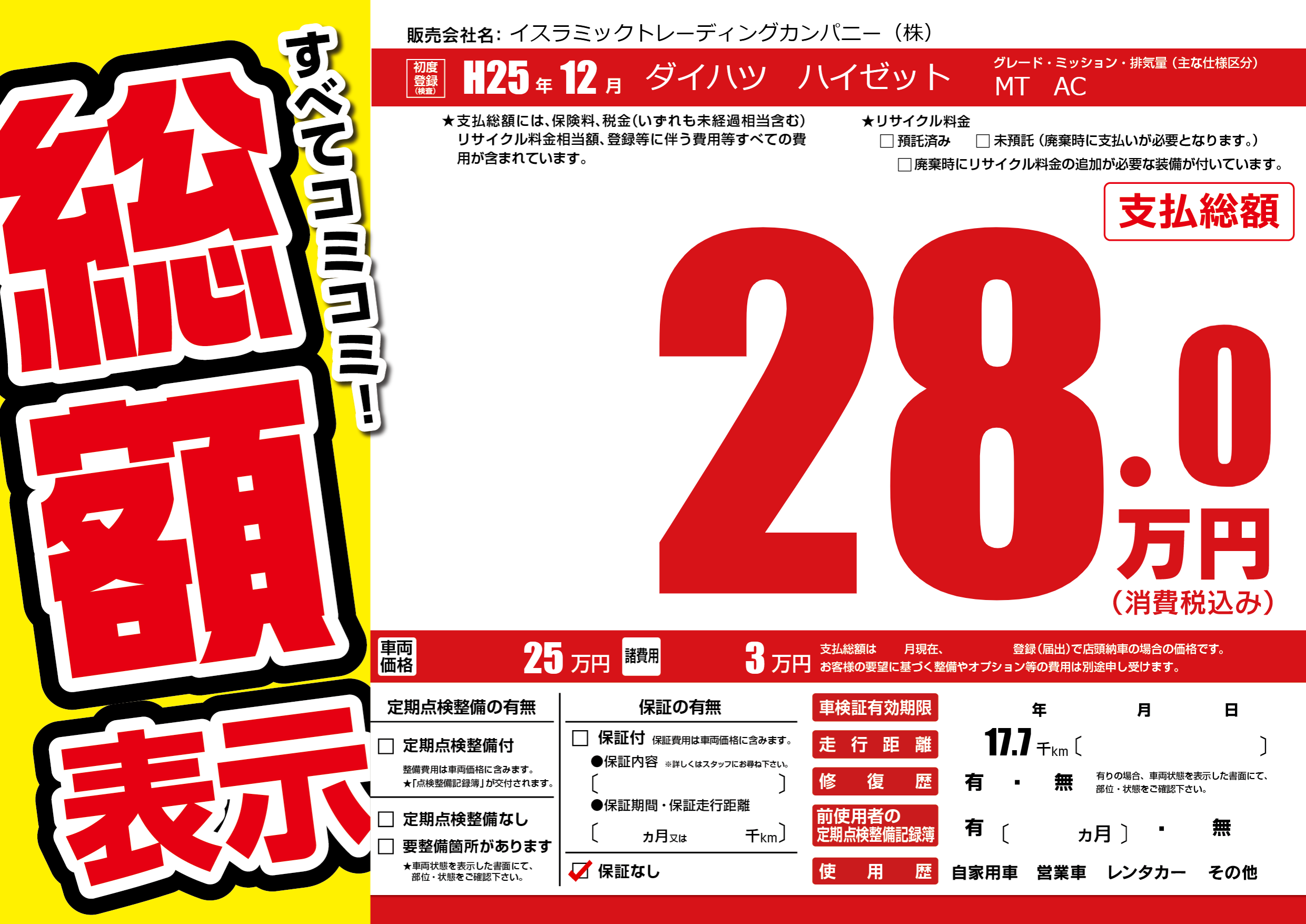 | 車名 | ダイハツ ハイゼット | グレード ミッション 排気量 |