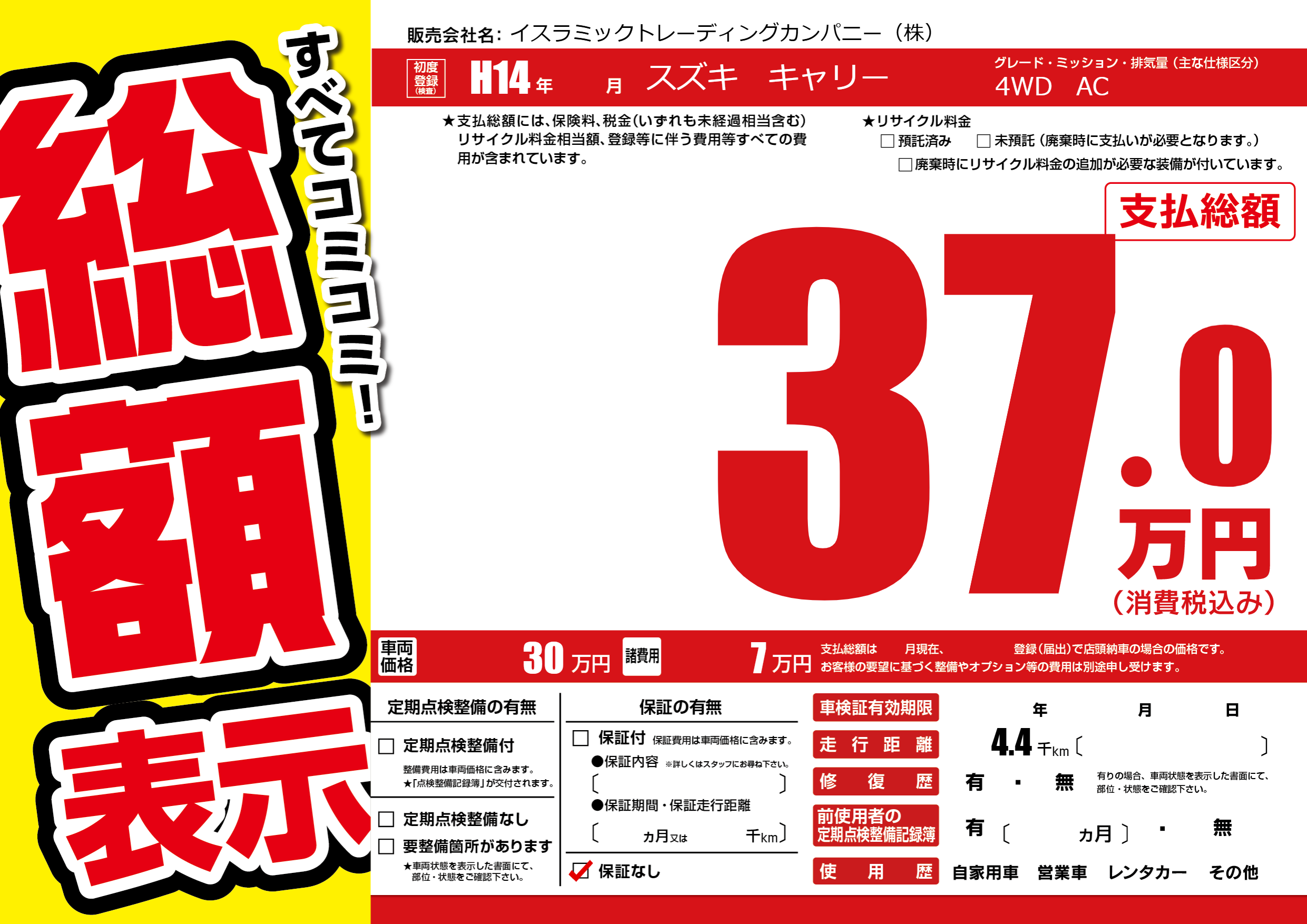 | 車名 | スズキ キャリー | グレード ミッション 排気量 |