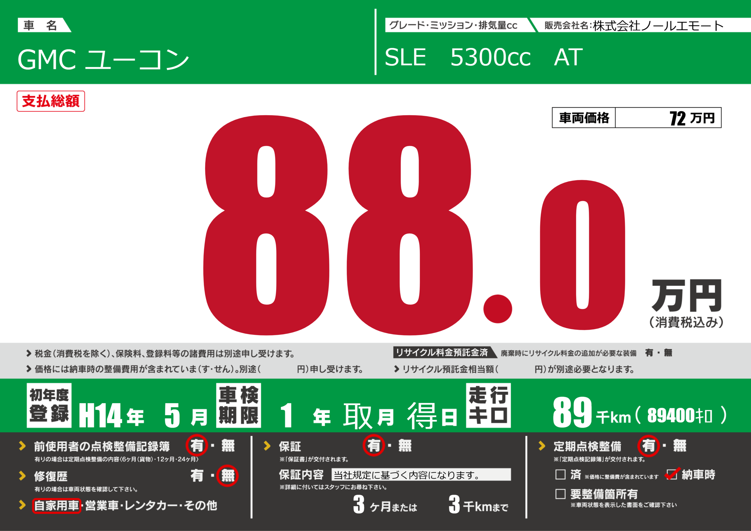 | 車名 | GMC ユーコン | グレード ミッション 排気量 |