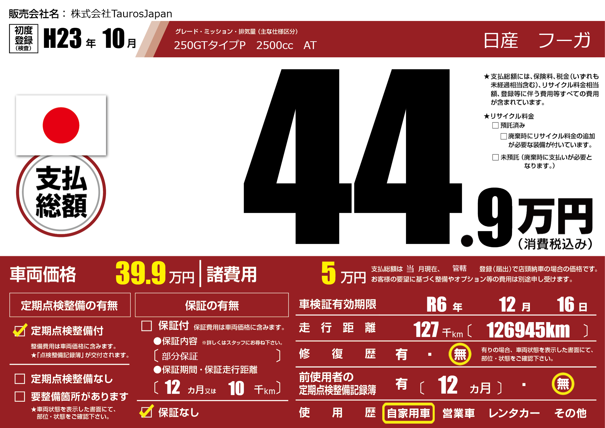 なし | 車検制限 | R6年12月16月 |