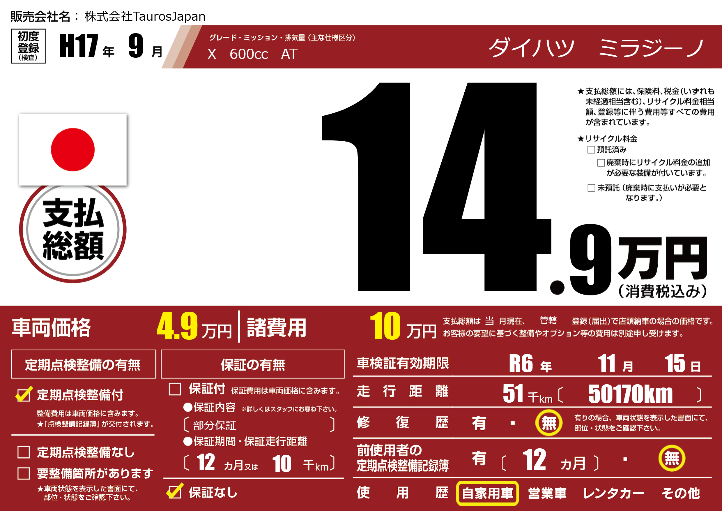 なし | 車検制限 | R6年11月15月 |
