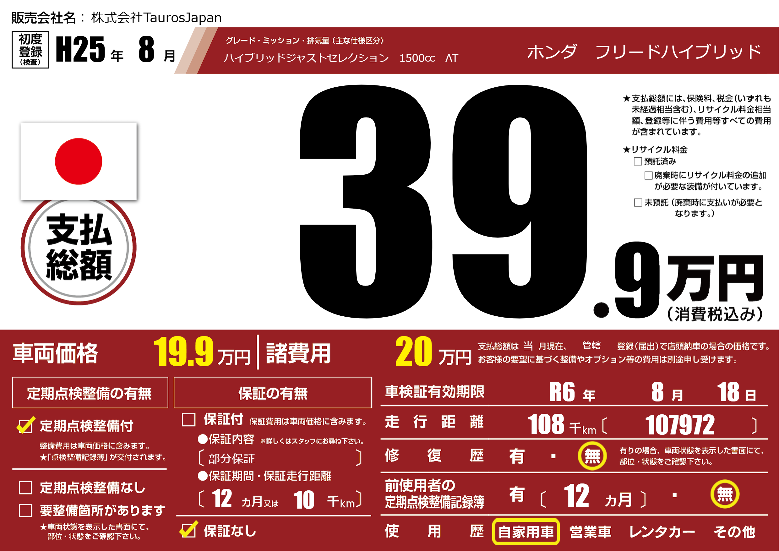 | 車名 | ホンダ フリードハイブリッド | グレード ミッション 排気量 |