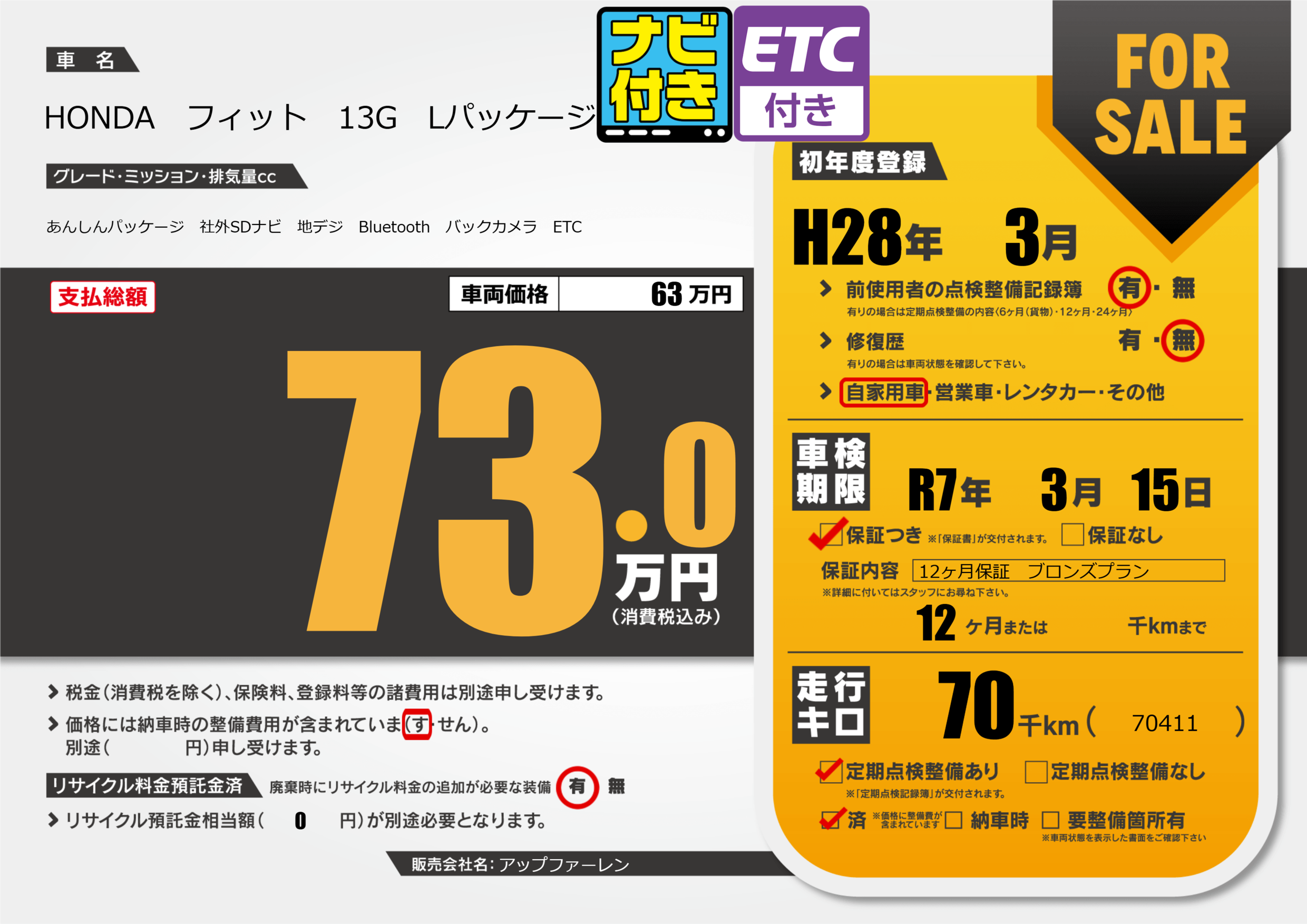 | 定期点検整備 | 定期点検整備あり 定期点検整備済み | ||