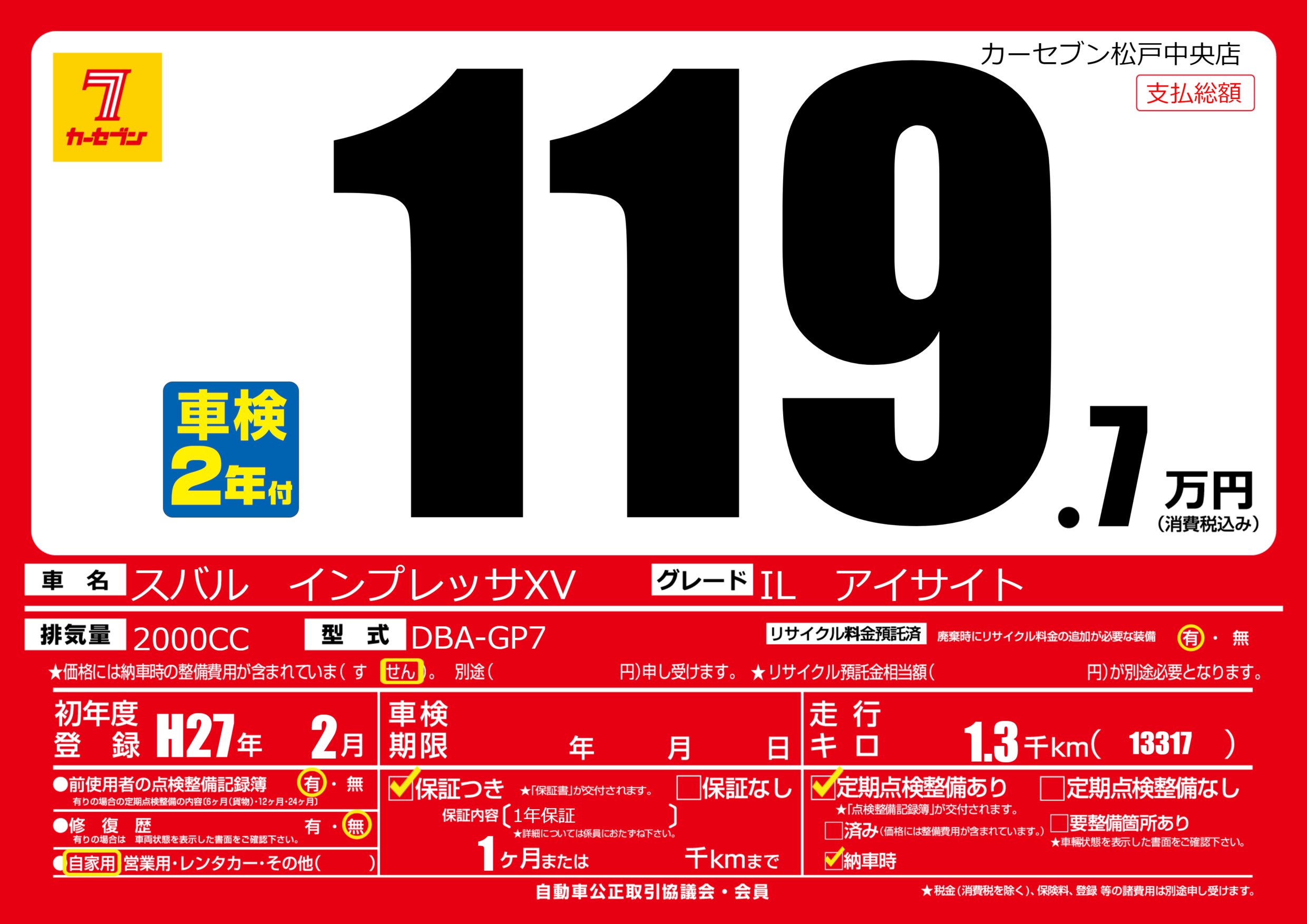 | 車名 | スバル インプレッサXV | グレード ミッション 排気量 |