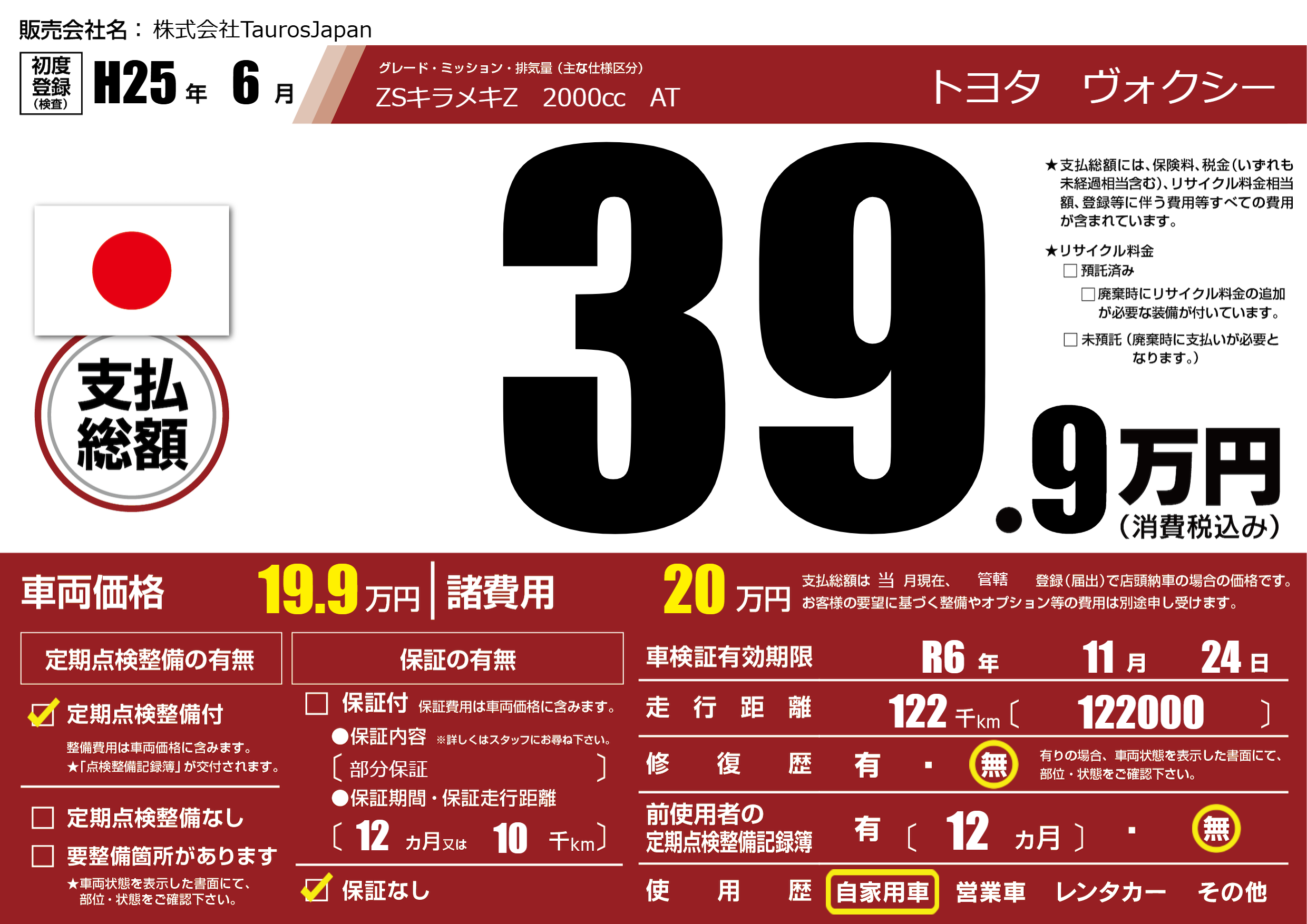 | 走行キロ | 12.2万km | 初年度登録 | H25年6月 |