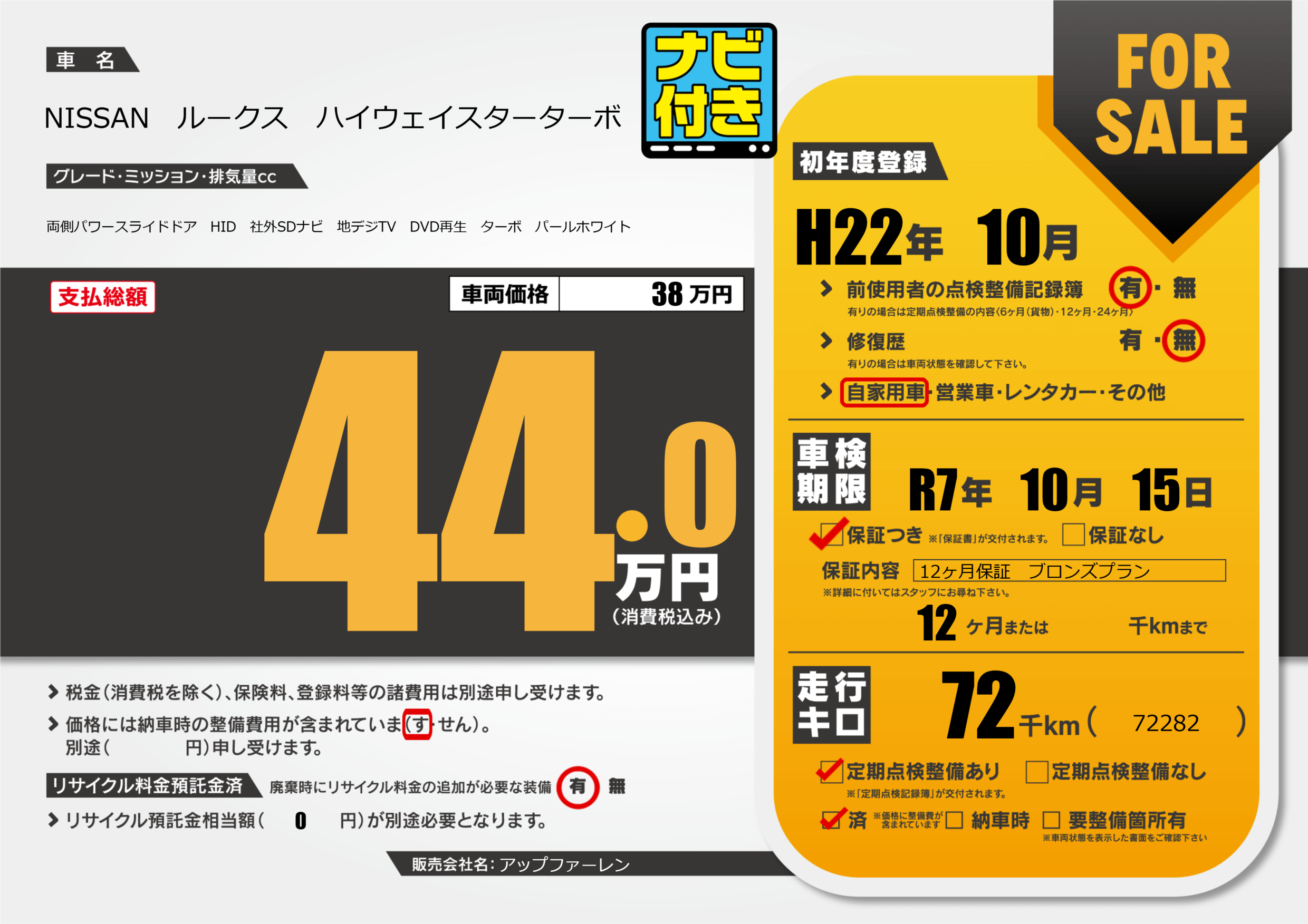 | 定期点検整備 | 定期点検整備あり 定期点検整備済み | ||