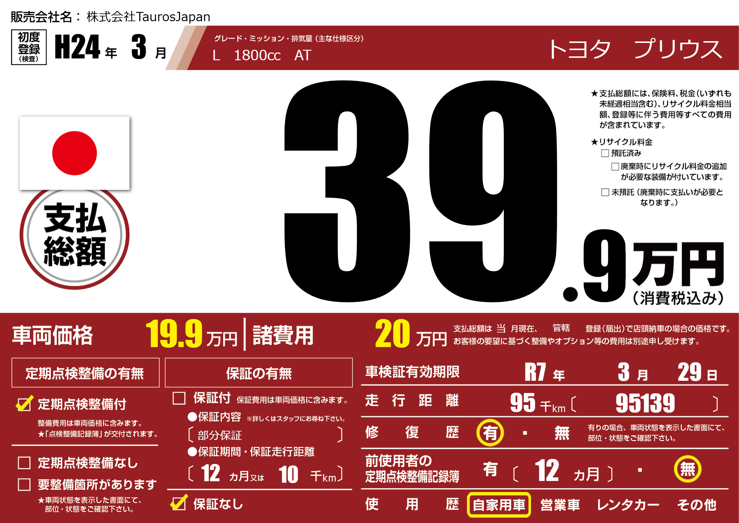 | 車名 | トヨタ プリウス | グレード ミッション 排気量 |