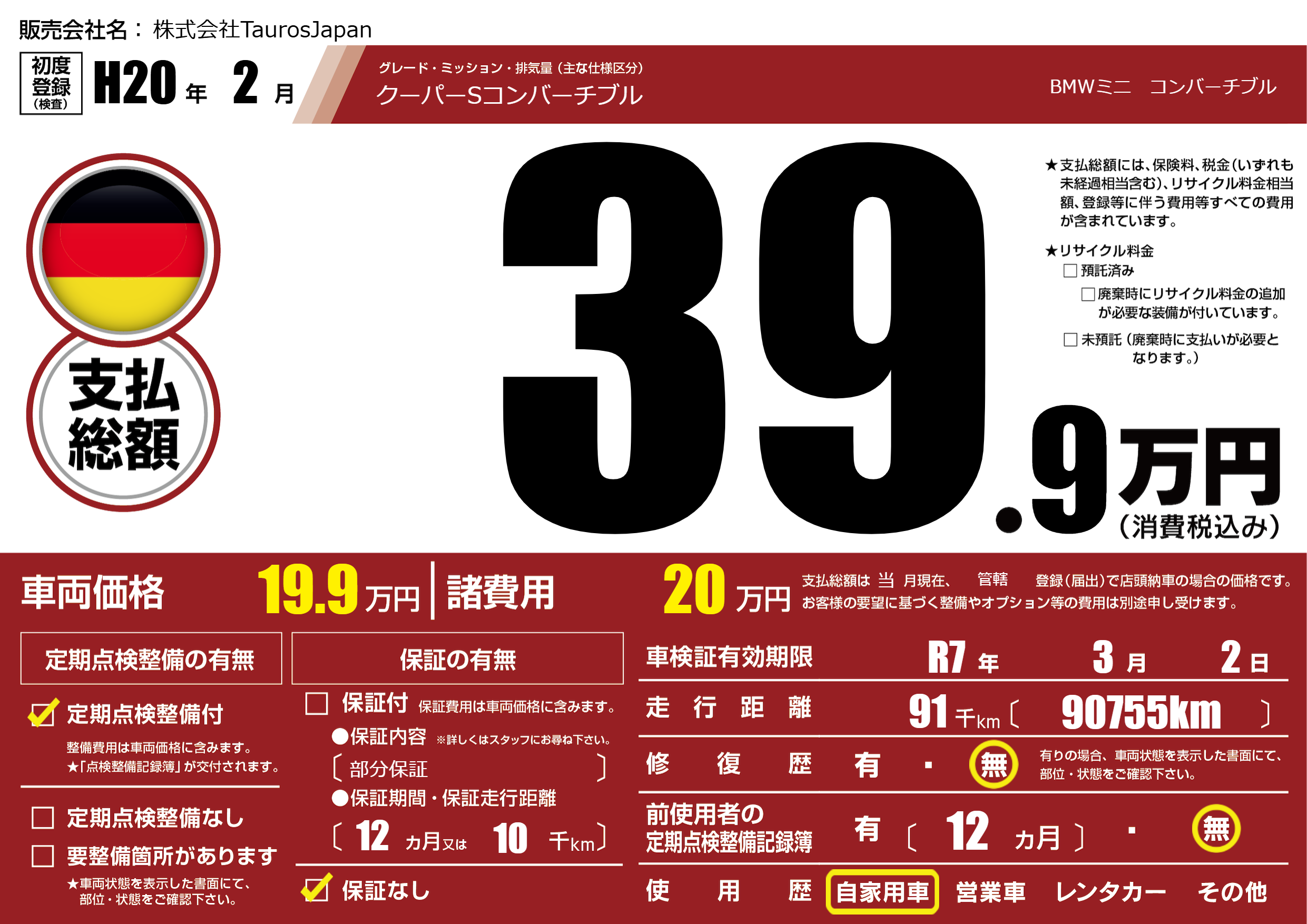 | 車名 | BMWミニ コンバーチブル | グレード ミッション 排気量 |